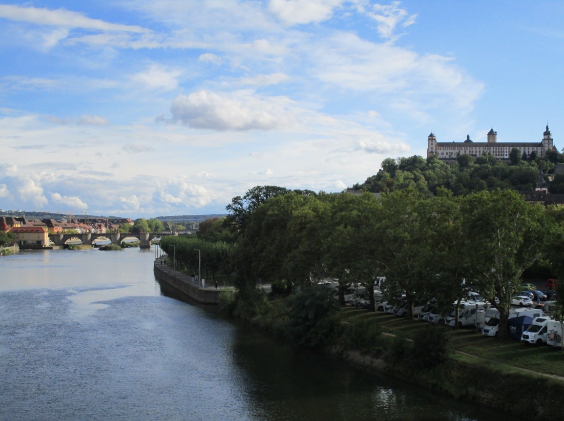 Wir sind am Main flussab entlanggeschlendert und befinden uns auf der Friedensbrücke – Blick auf die Altstadt.