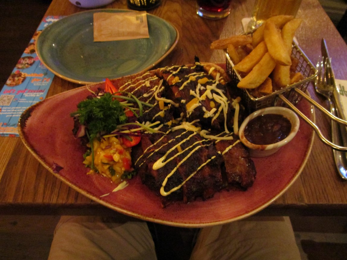 Zum Glück hatten wir für den Abend Plätze „beim Mexikaner“ reserviert. – Der ist knallvoll – offenbar ist gutes Essen, hier Spare Ribs, und Trinken der Grund dafür.