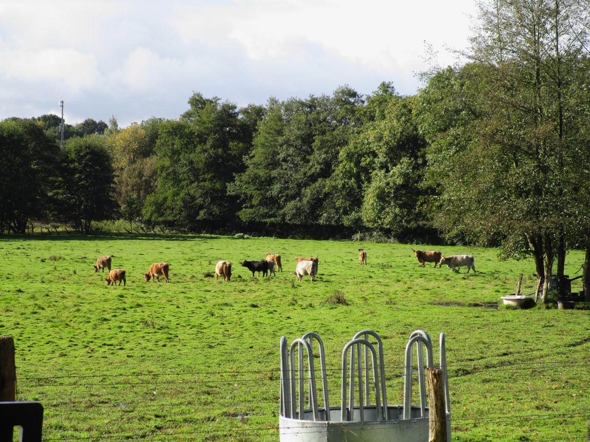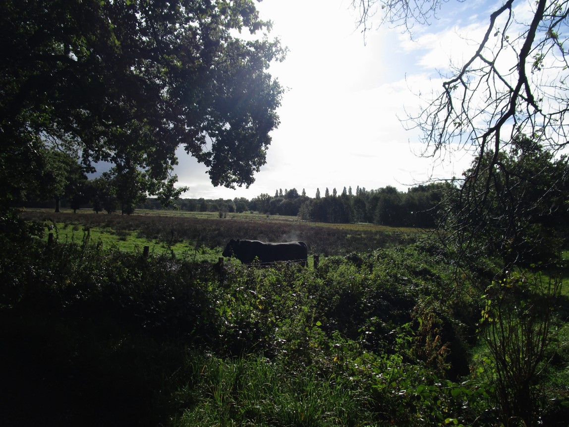 Der vor kurzem noch nassgeregnete Angusbulle steht – abseits von seiner kleinen Herde – im Windschatten, die Sonne heizt. Er dampft ordentlich.