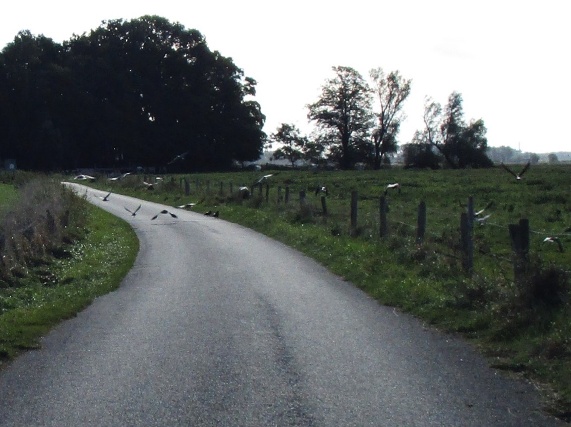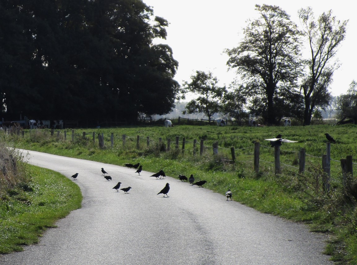 Kolkraben und / oder Rabenkrähen lassen die Früchte aus größerer Höhe fallen. Oft genug klappt es im ersten Versuch, dass die Nuss anschliessend zugänglich ist. – Der Schmaus am Wegesrand kann beginnen. Sobald wer naht, fliegen die Vögel auf, …