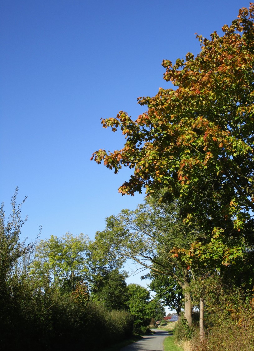 Morgensonne in der Marsch bei Hetlingen – Spitzahorn startet Herbstfärbung, Eschen (später Gelb) ringsum noch nicht ganz.