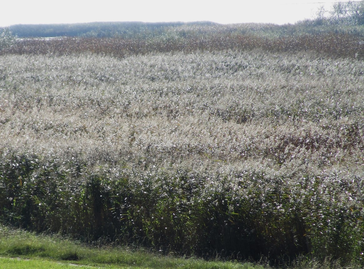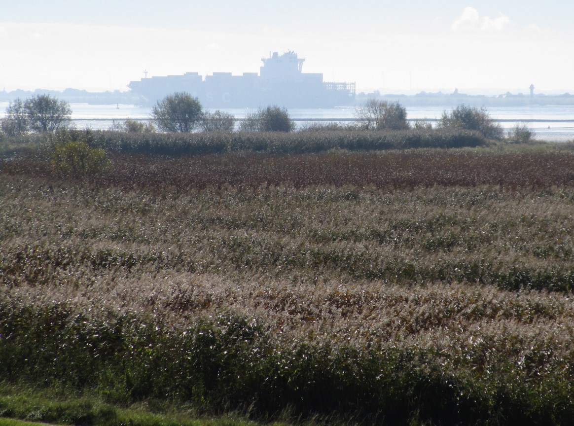 Elbdeich Hetlingen – das Reet liegt, abge“tau“t, in der Morgensonne. Der Frachter stellt sich als ein Großer heraus, knapp 400 m.