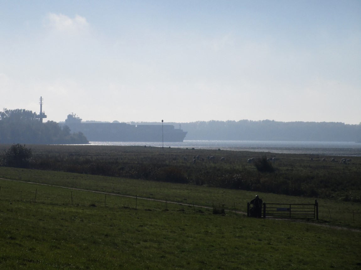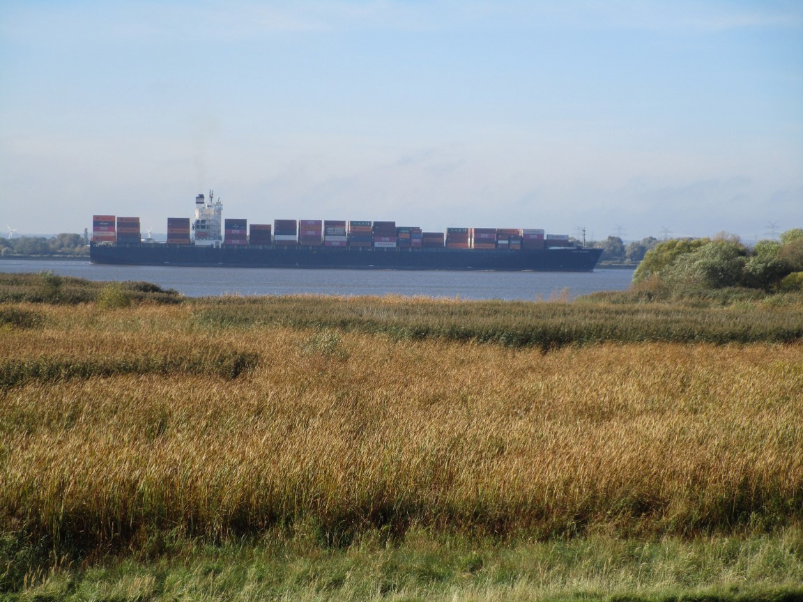 Elbdeich Hetlingen – über der Elbe noch Dies, ein knapp 300 m langer Containerfrachter zieht gen Hamburger Hafen.