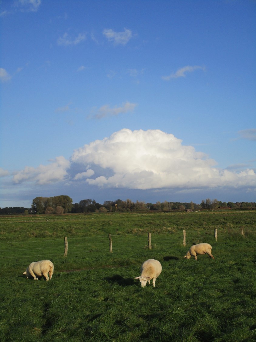 Blick von der Deichkrone „binnen“ – bunte Rinderherde in der Marsch, angeschienener Wolkenberg (Achtung: schwarze Basis, teils grau-klackerige Seite).