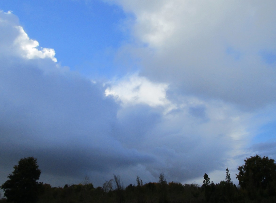 Rasende Wetter am Nachmittag – vor allem eine vorn ziehende, längliche leicht blauviolette (??) Wolke erscheint uns bedrohlich.