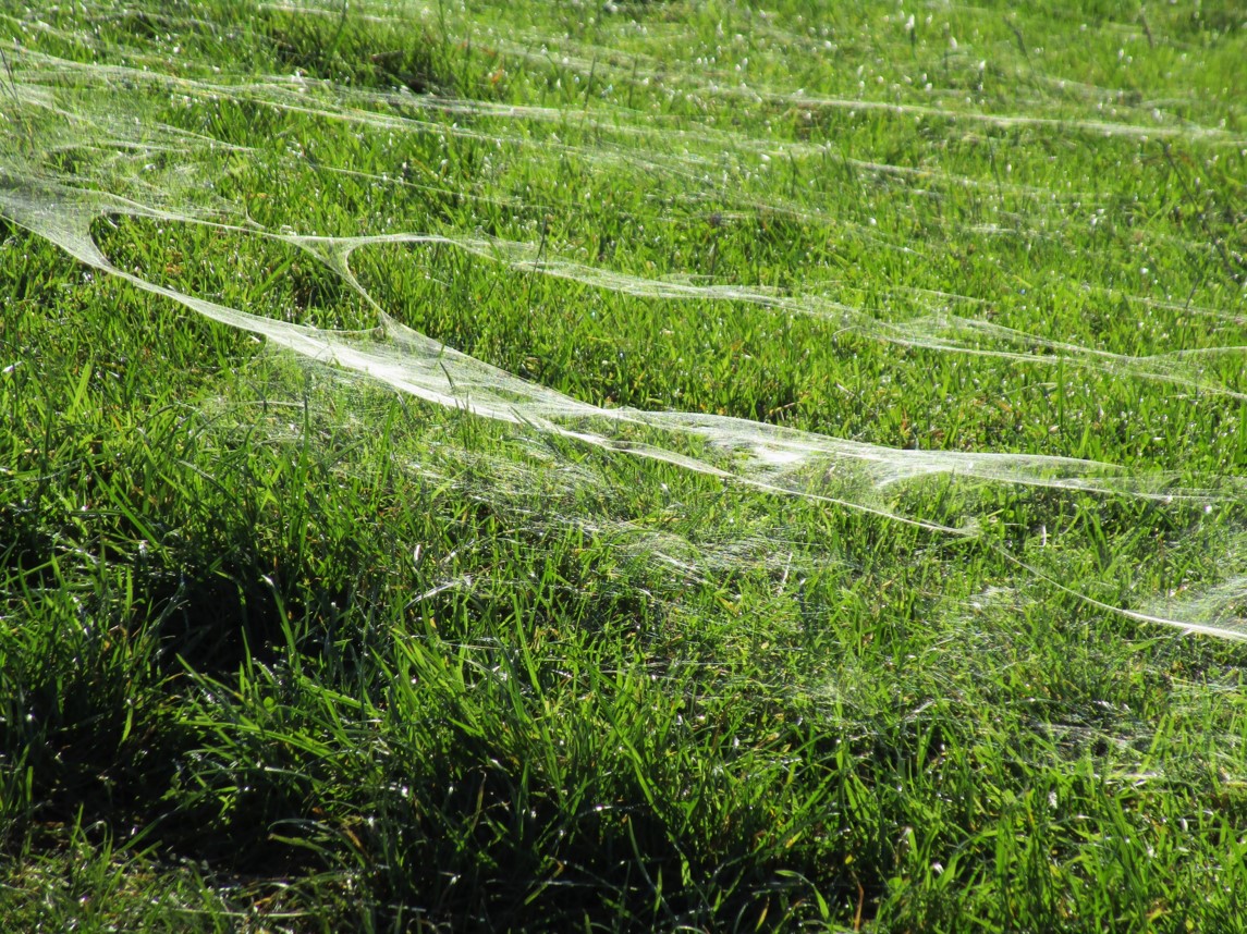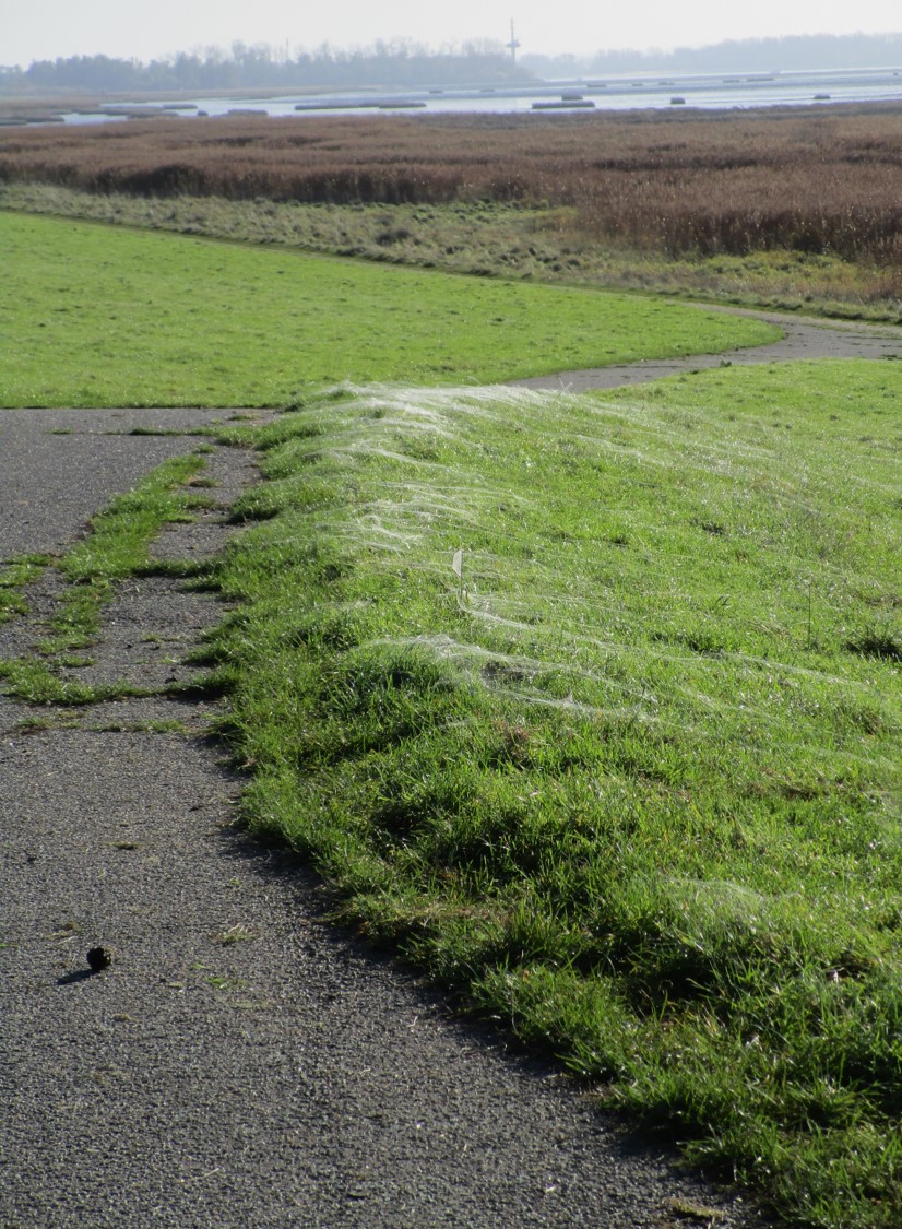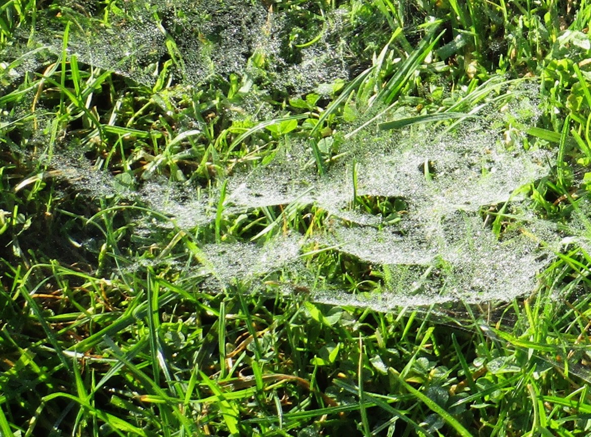 Tautropfen-belegt bleiben, wohl bald nicht mehr erkennbar, kleinere, eher runde Netze – dies etwa 1/4 m² groß.