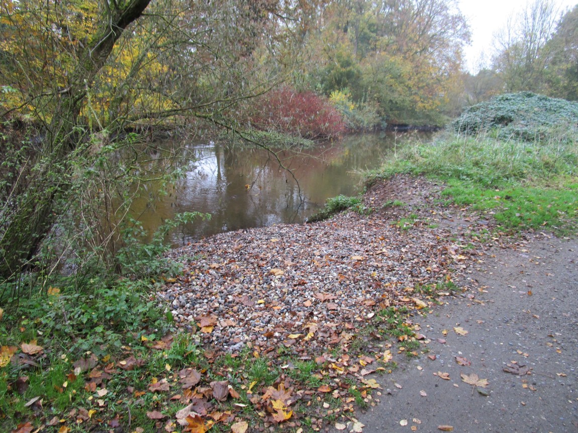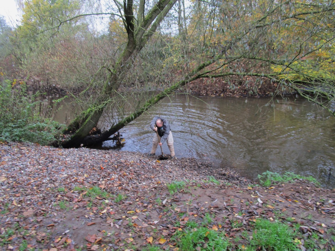 Mit Harke und Schaufel legen wir aus geringem Kiesüberschuss den Ansatz eines Unterwasserlenkers. Die mehrstämmige, schrägstehende Weide ist erstmal geschützt.