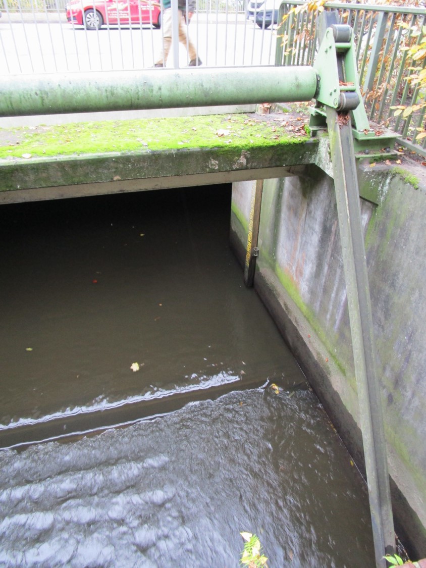 Blick in die Krückau unmittelbar oberhalb des Mühlengebäudes – bekannter Anblick! – Die Erneuerung von Wehren – praktische Hydraulikausrichtung – hat, wie hier zu sehen, fast überall zwei (seinerzeit neu geschaffene) Hindernisse zur Folge. Der Strömungsabriss auf der Sohle = Kante („der Ochs vom Tor“ !) sowie die folgende Schräge verhindern Organismenwanderungen.