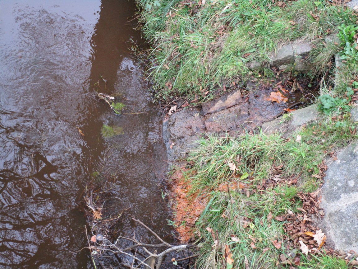 Blick senkreckt von der B 431-Brücke Holmau – massenhafter Eisenaustritt, Zeichen des gestörten Bodenwasserhaushalts.