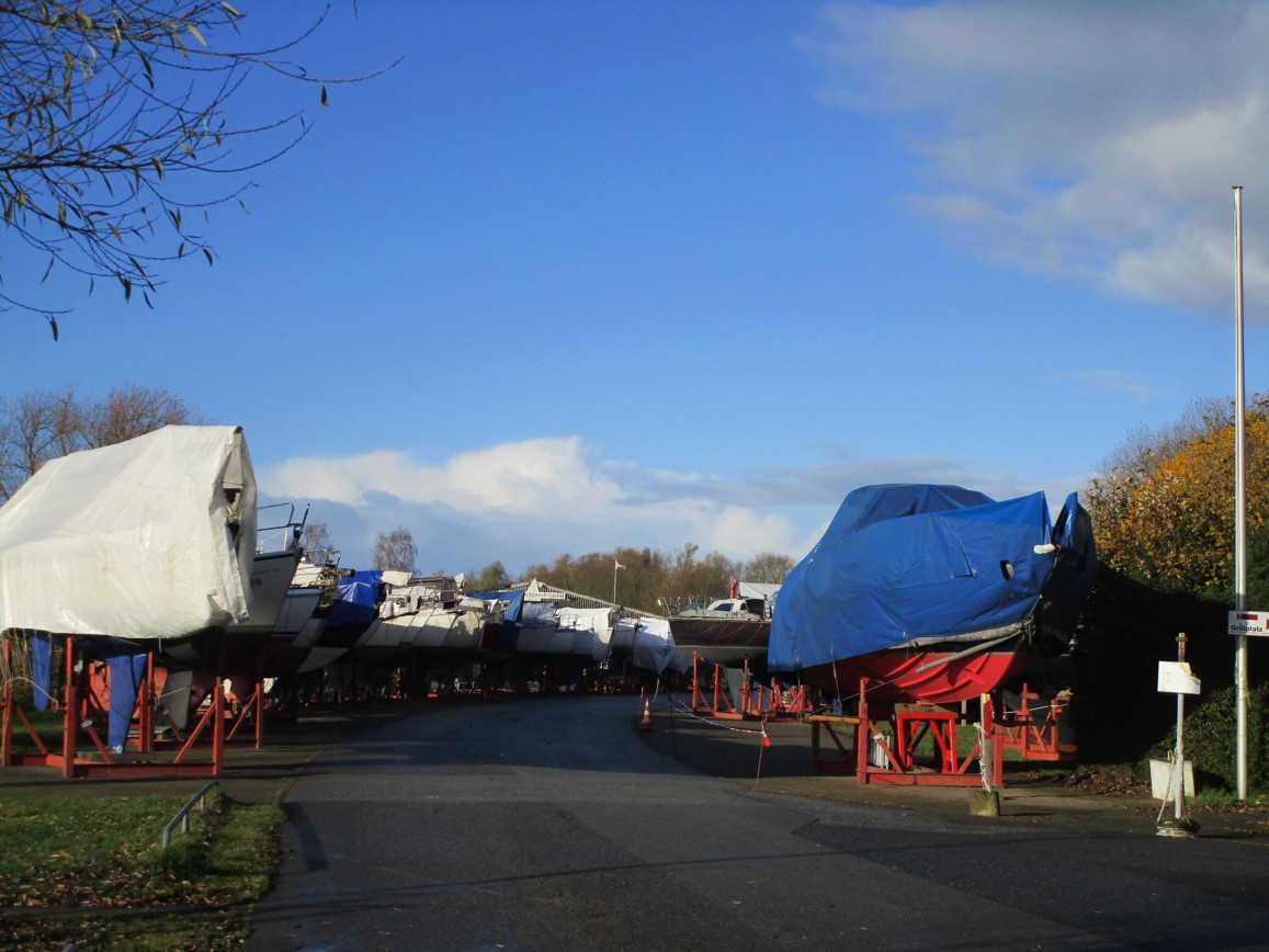 Auch der große Parkplatz entlang der östlichen Anfahrt sowie die großen Hallen sind mit Booten und Yachten gefüllt. Andere Eigner haben ihre Boote abtransportiert und an geeigneten Winterlagern anderswo untergebracht.