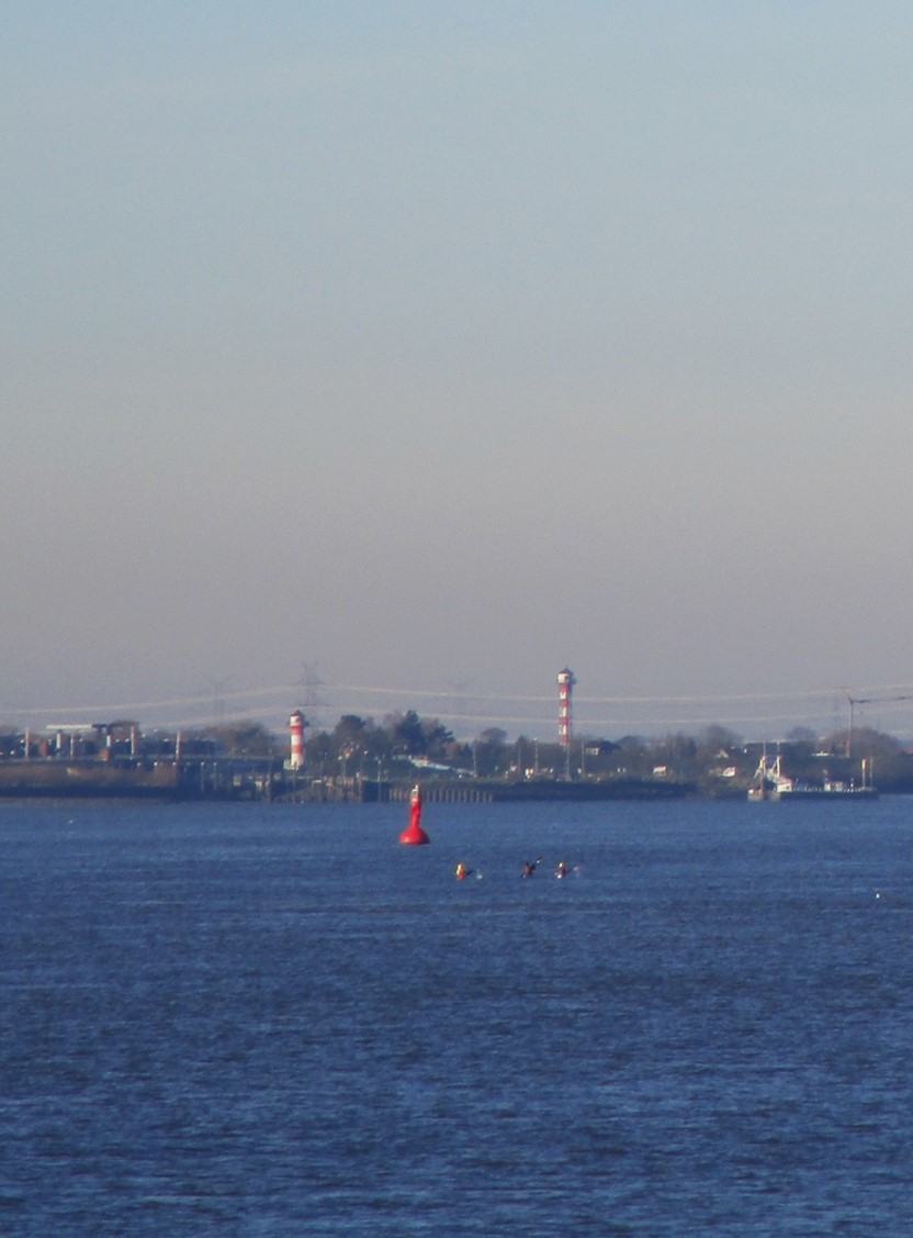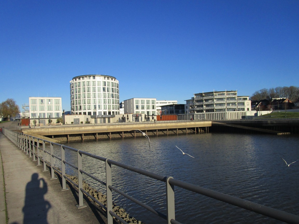 Letzter Blick gen West Richtung Lühemündung – rechter Hand die Baustelle am Hamburger Yachthafen, Wedel.