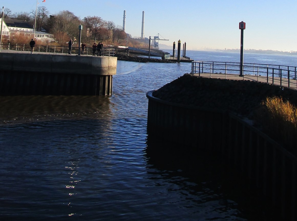 Der Flutstrom startet, drängt trübes Elbewasser ins Hafenbecken.