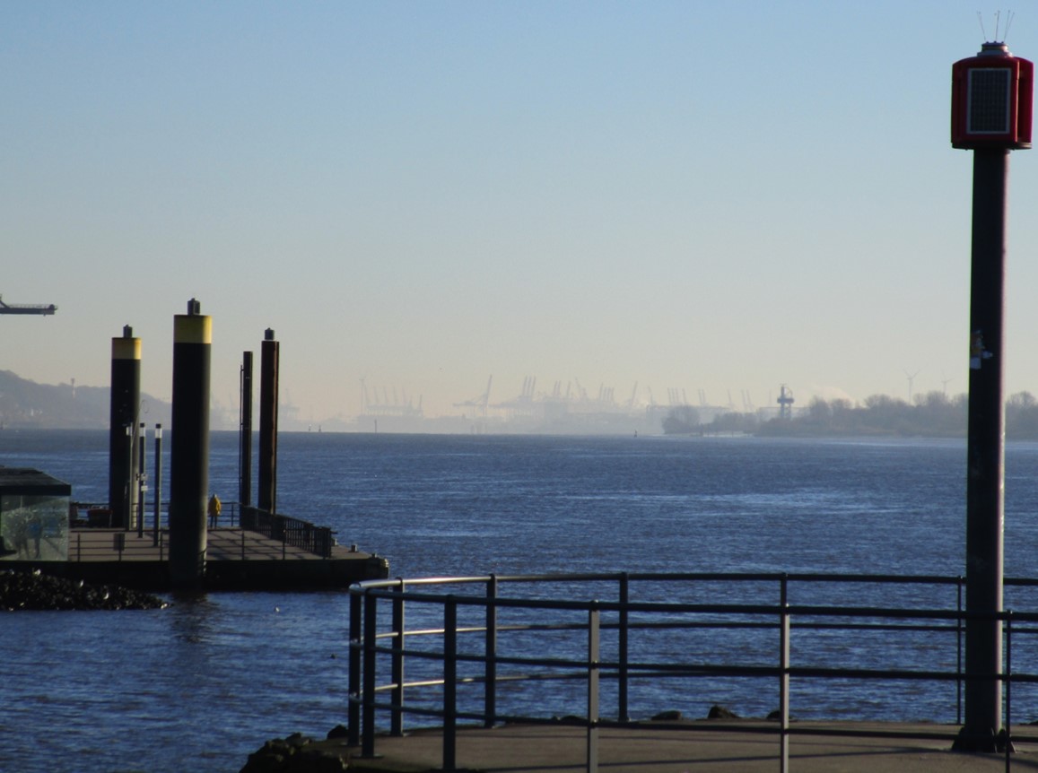 Winterlich diesig stellen sich die Hamburger Hafenkräne am Horizont dar.
