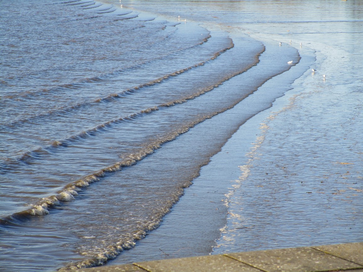 In breiten Wellenreihen drängt die auflaufende Flut über das Watt.
