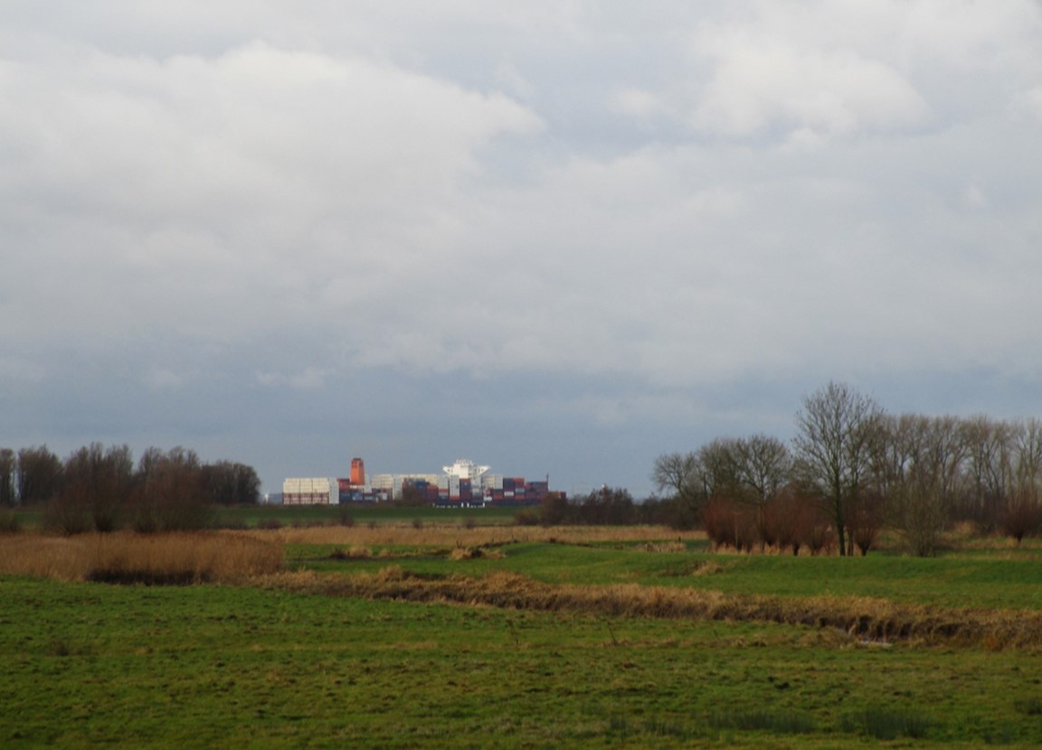 Blick von der Schulauer Straße Richtung Elbdeich – hoch fährt Containerfrachter Santos Express seewärts, 269 x 48 m, Tiefgang 12,5 m.