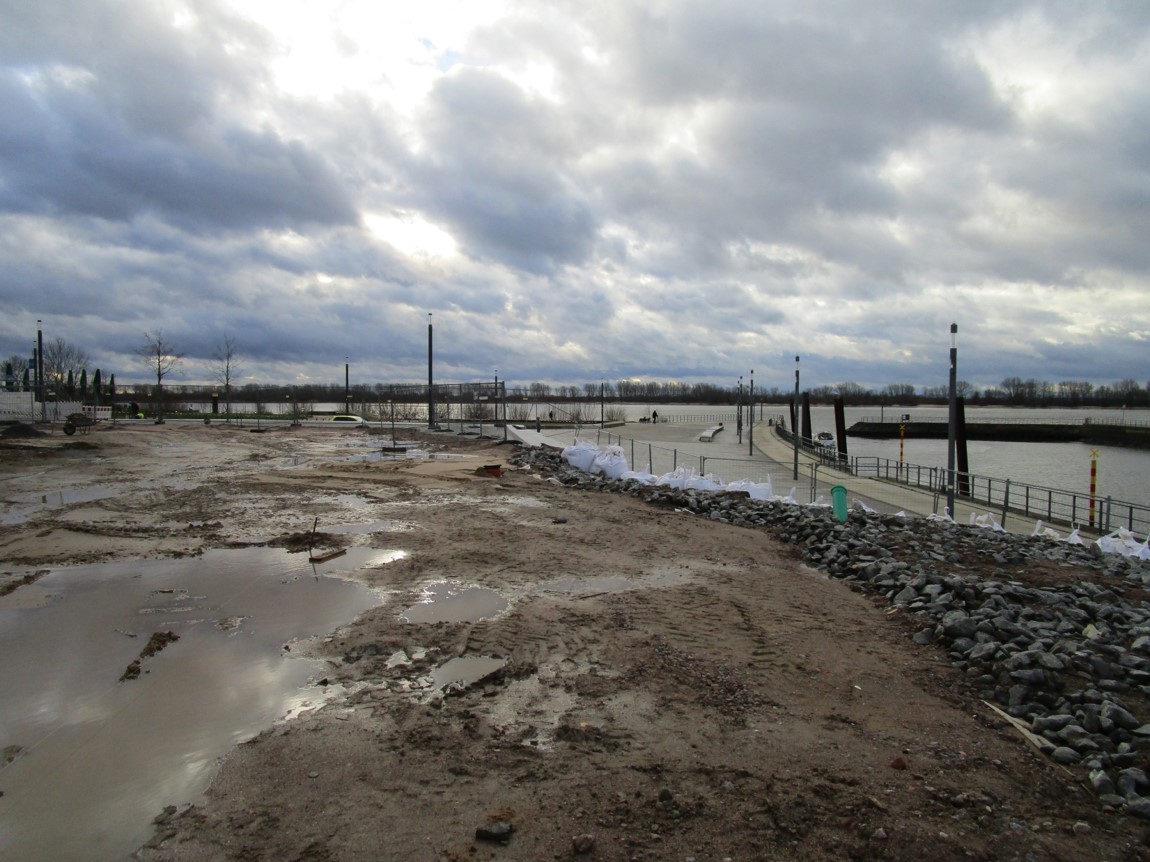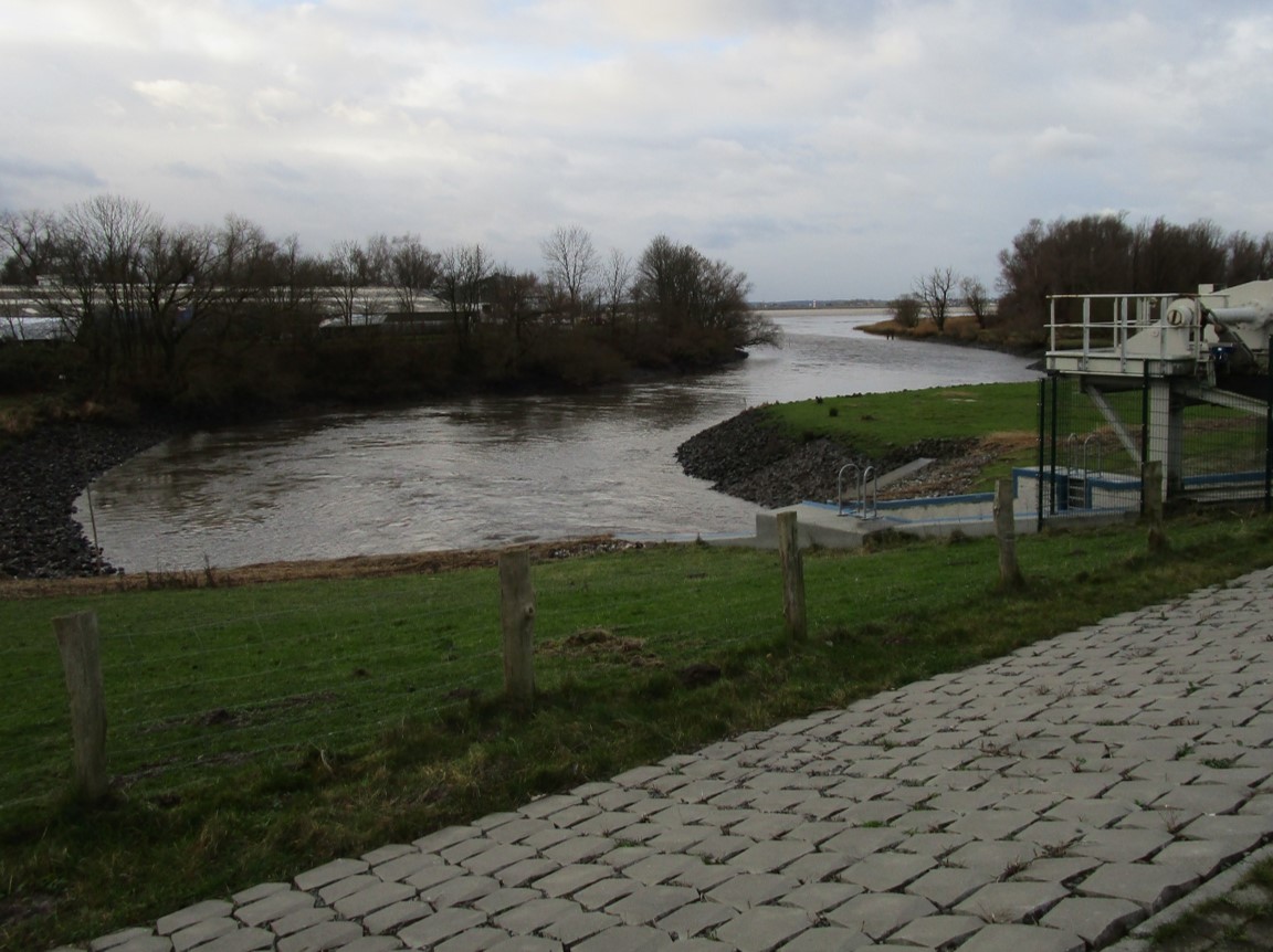 Starker Abfluss, vorn, aus der Binnenelbe Richtung Elbe – von dort, gegenan, drückt der Südwest Wellen in den Mündungstrichter.