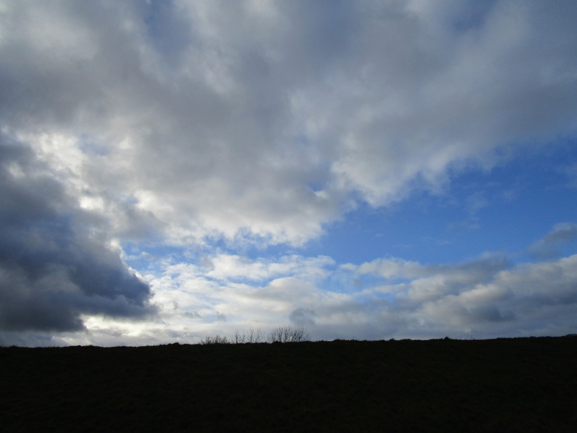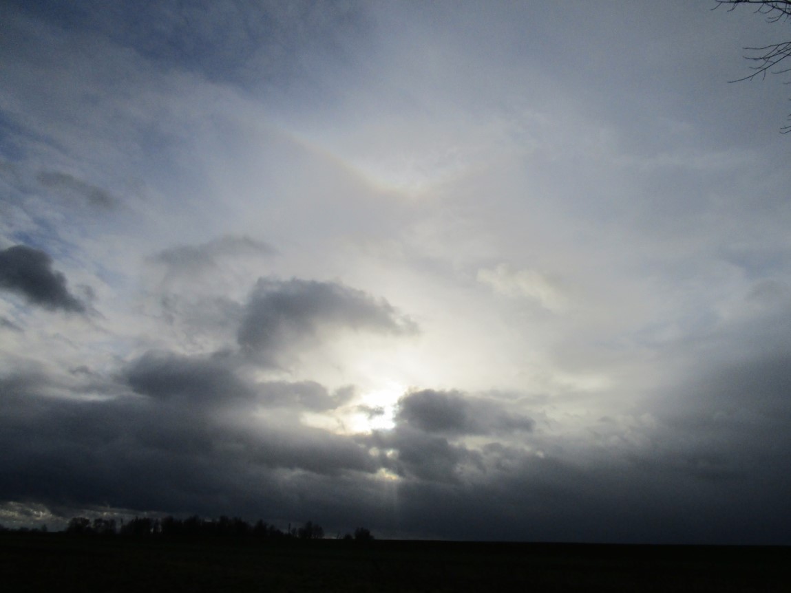 Gen Geesthang, Blick zurück Richtung Deich – hat es mich doch erwischt! – Es fallen aber, peitschend, nur nieselige Tropfen.