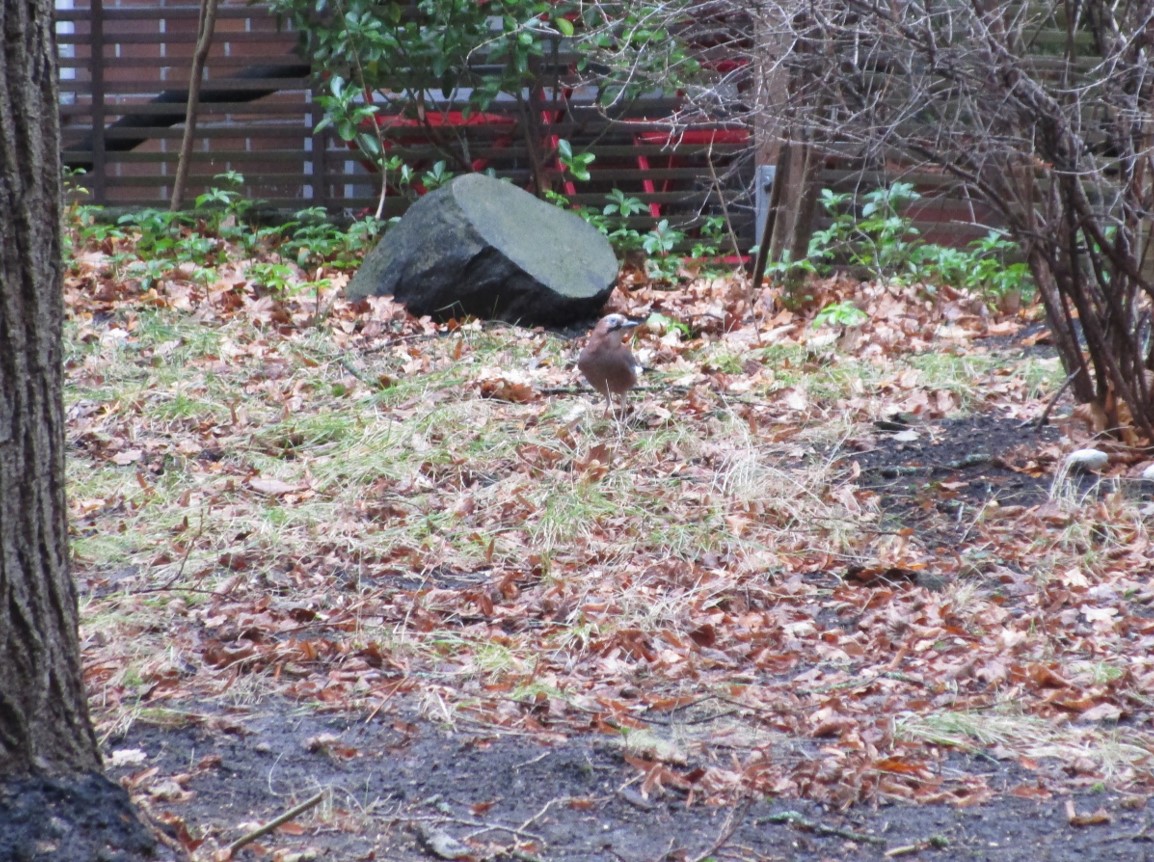 Im Hinterhof begrüßt uns ein Eichehäher – findet angesichts 3er Altbäume gut Nahrung.