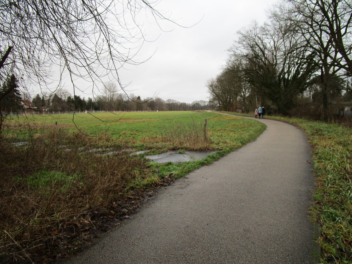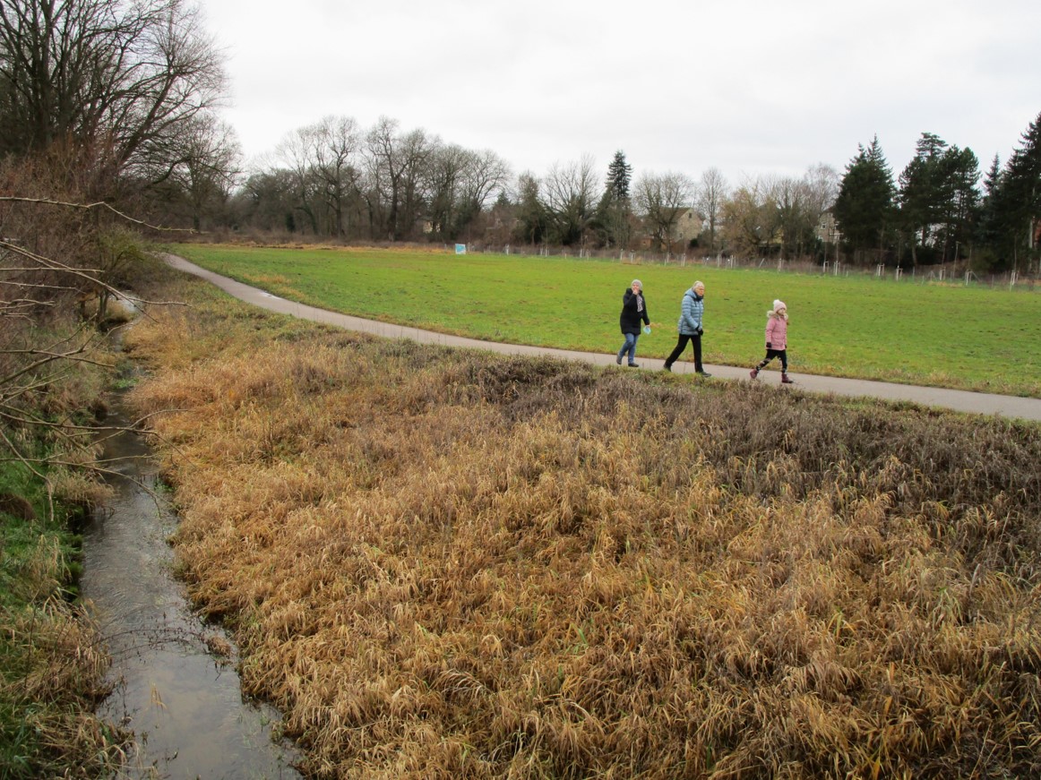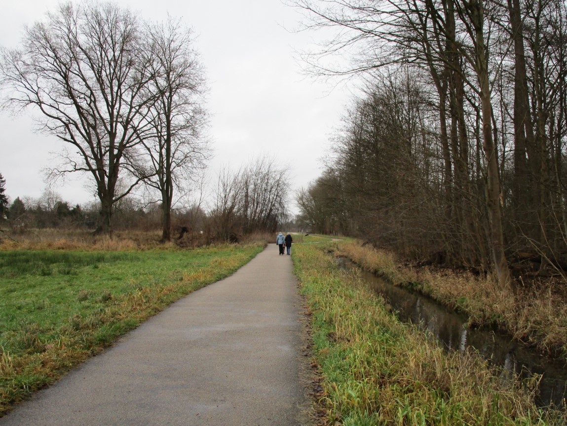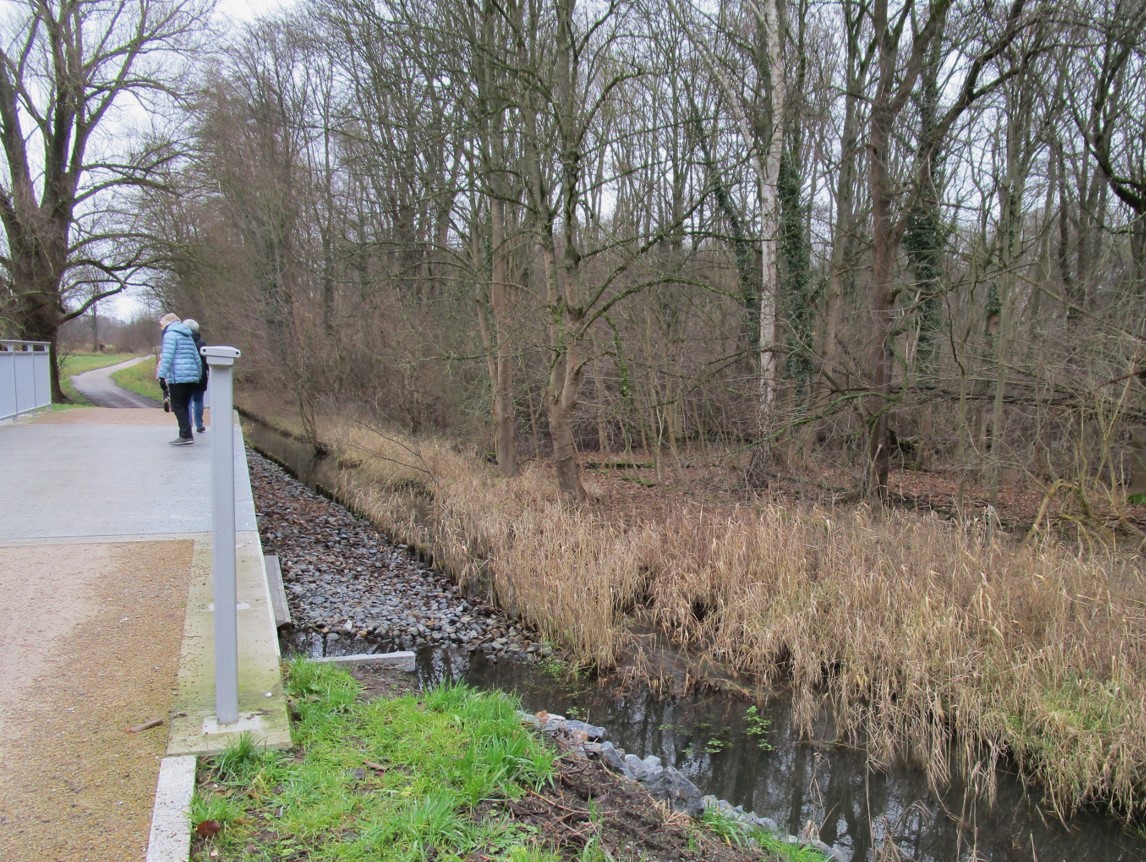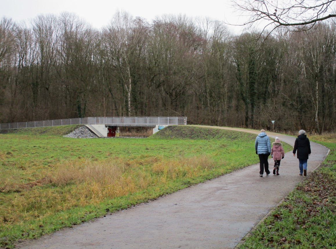 Die neue nördliche Brücke ist erreicht. Der Radweg verlässt den Wiesenbereich ostwärts. – Meine Begleiterinnen wenden nach Betrachten des Gewässerquerschnitts im Brückenumfeld.