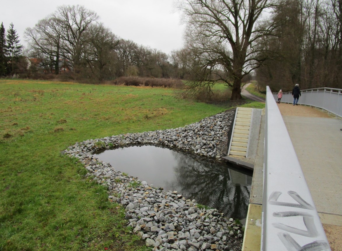 Ganz im Norden am Pankeoberlauf, nahe der Landesgrenze zu Brandenburg, geht es nun weiter. Vorbereitend sind zwei Brücken am Europaradweg neu gebaut worden. Die Umgestaltung des Bachs, Verlegen in die Pölnitzwiesen, soll dieses Jahr beginnen.