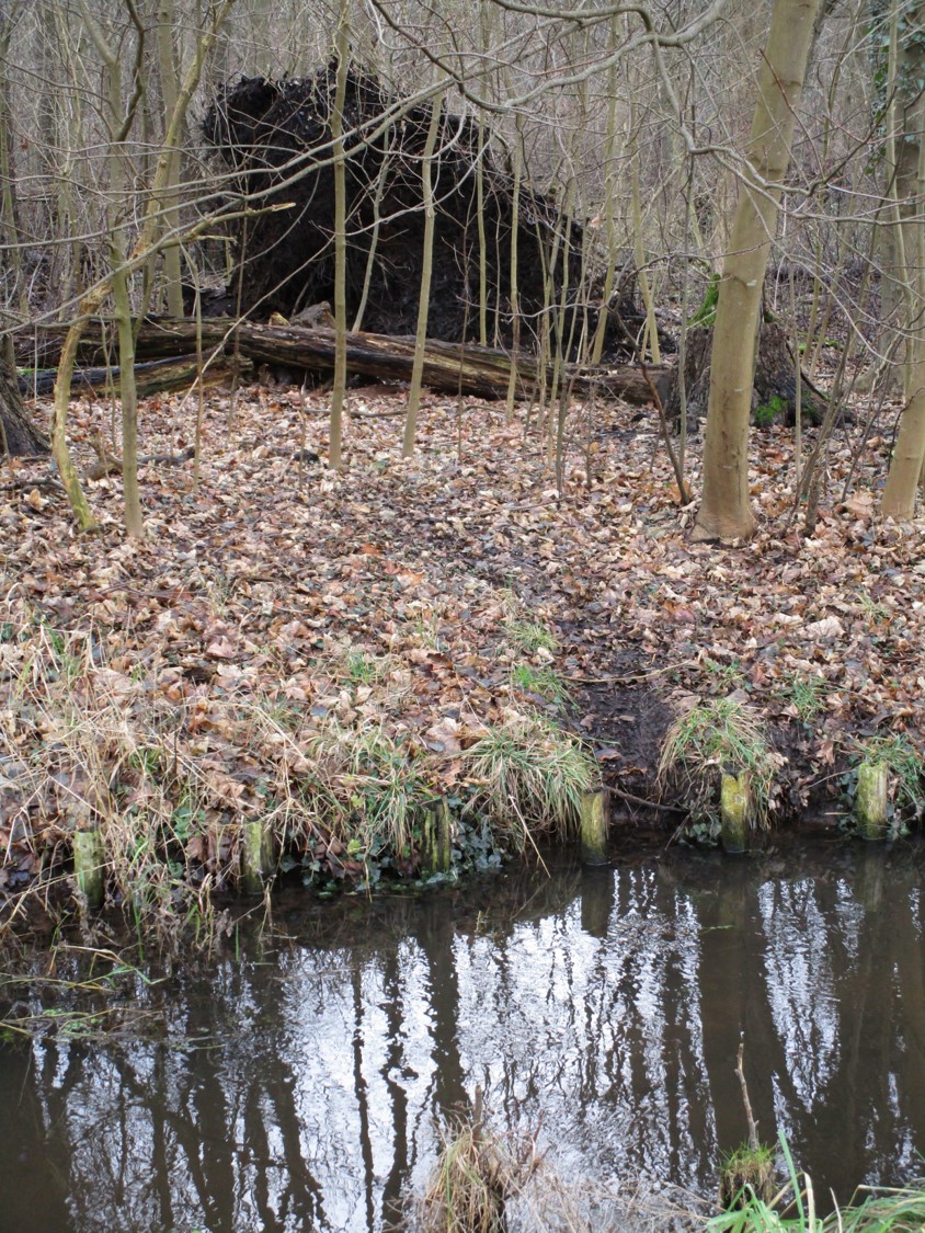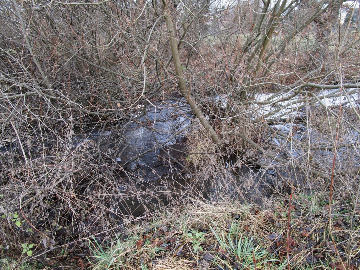 Im Übergang von der überlichteten, mit Sumpfpflanzen zugewachsenen Bachstrecke staut eine alte Buschweide den Abfluss.