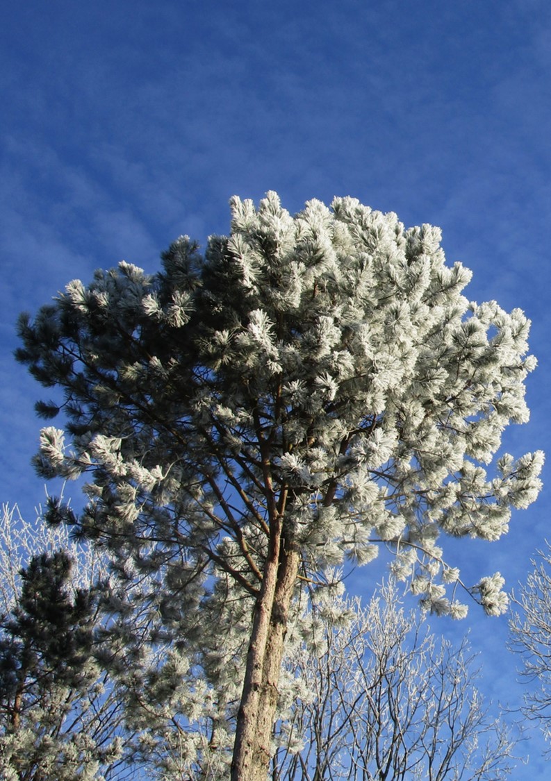 Raureif auf Nadel-, Laub- und Efeubäumen.