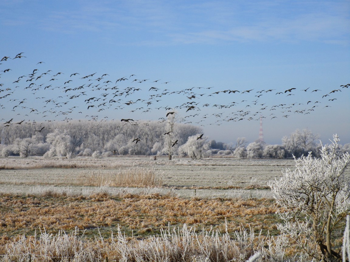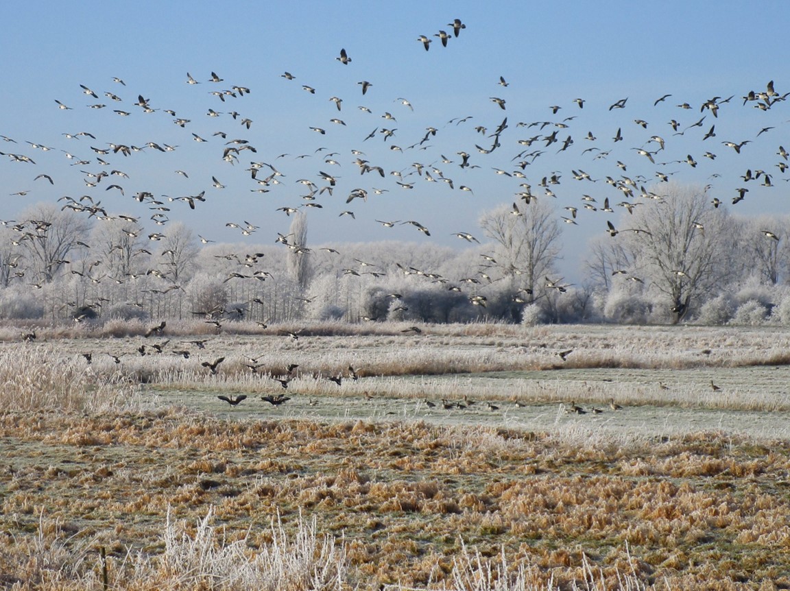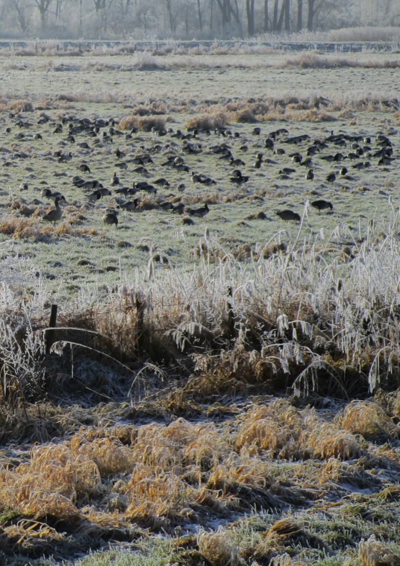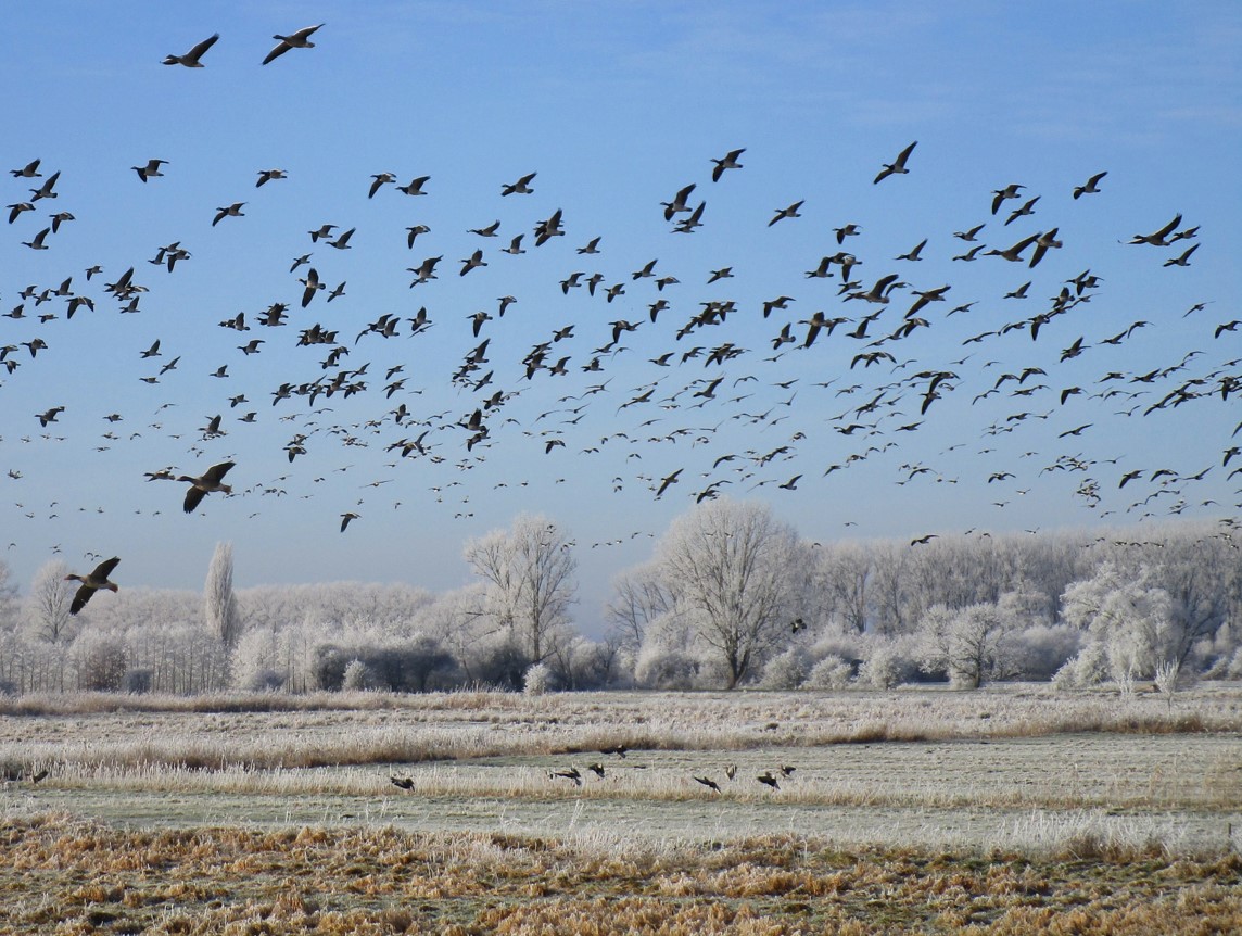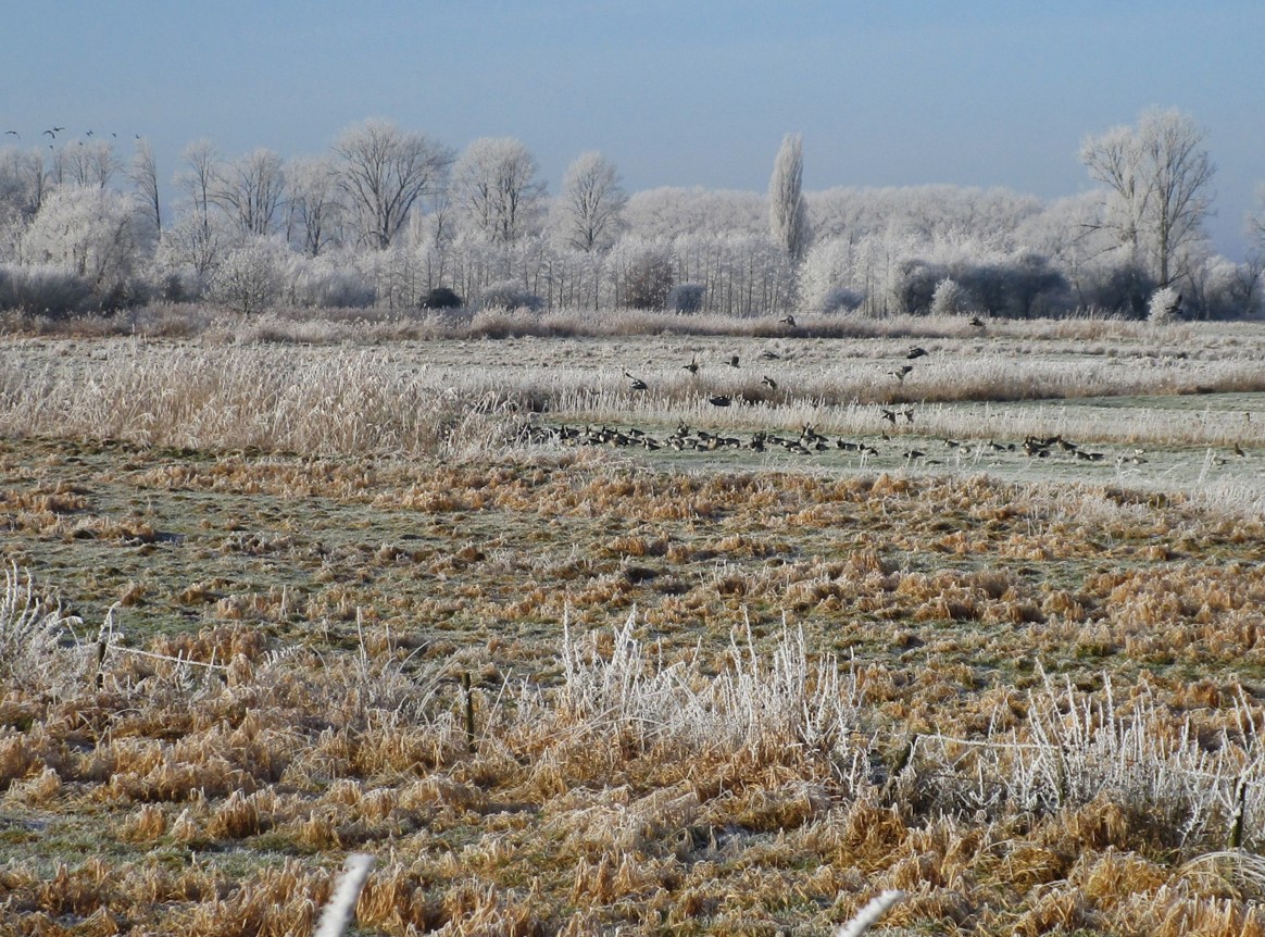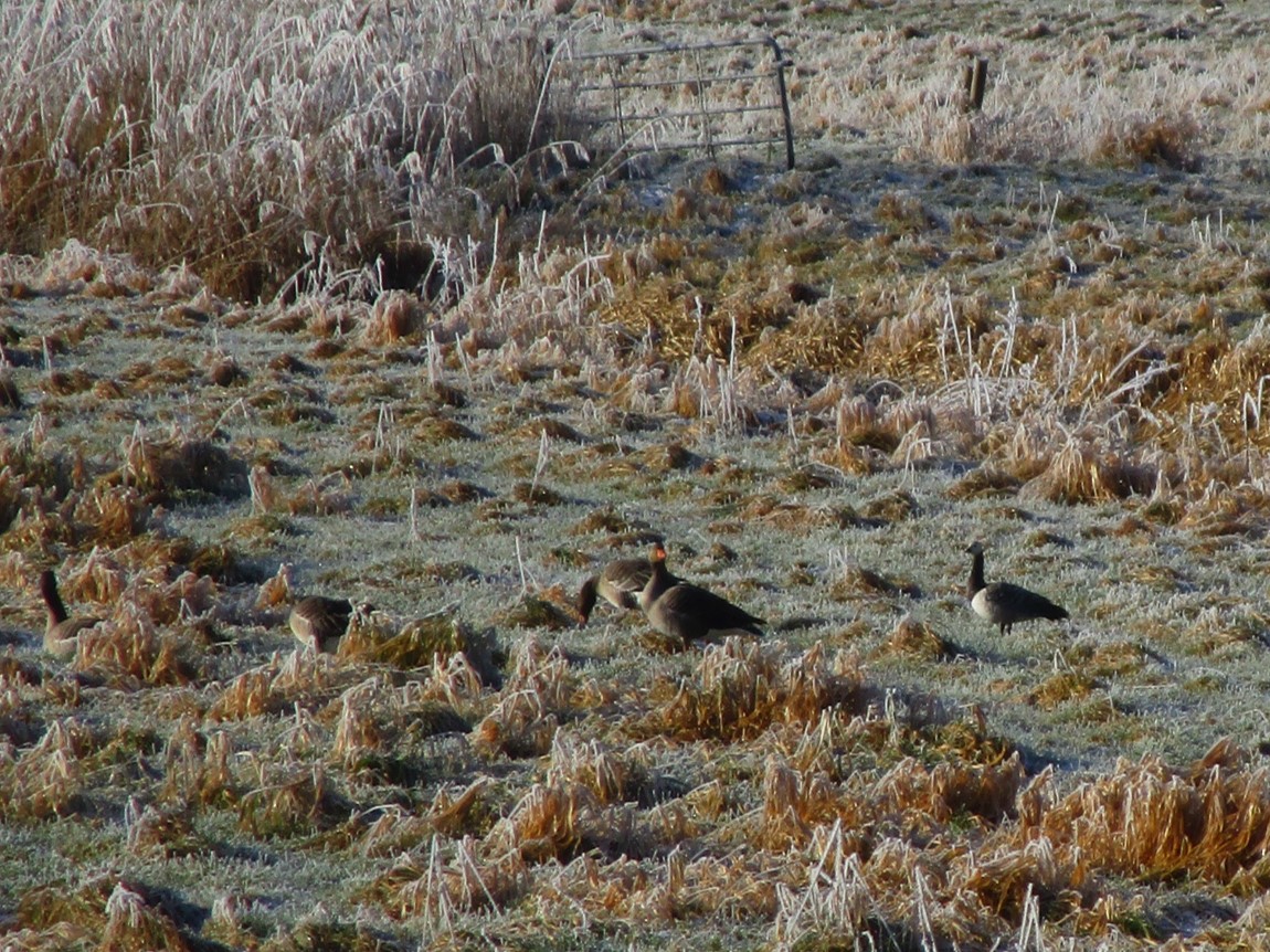 Vorn links sitzen ein paar Graugänse, die Masse Nonnengänse geht von mir weg.
