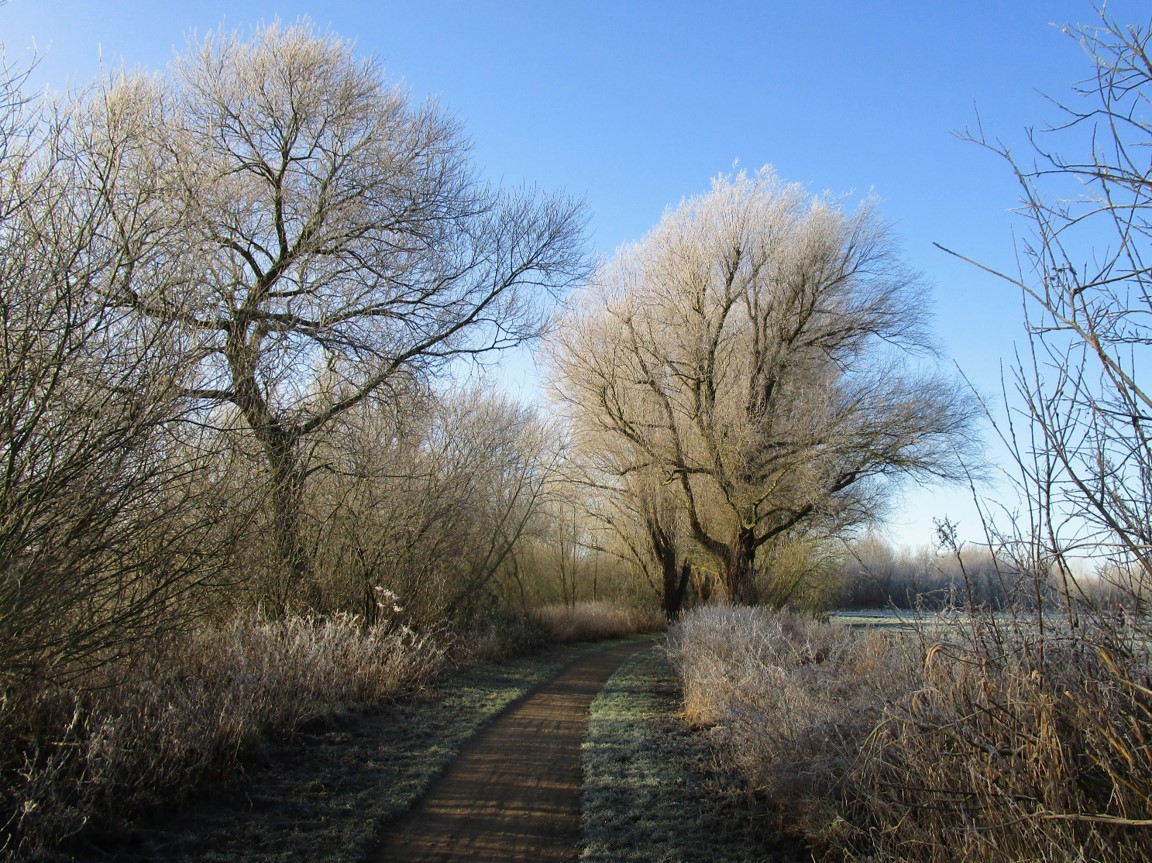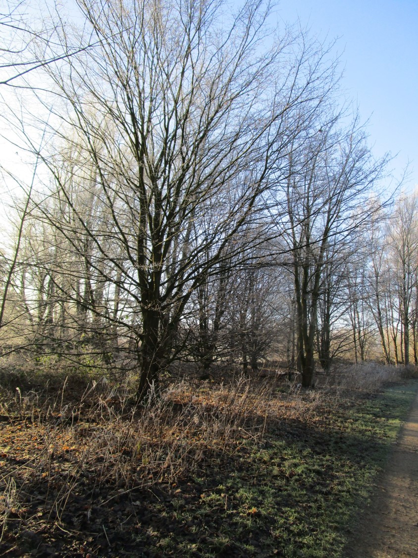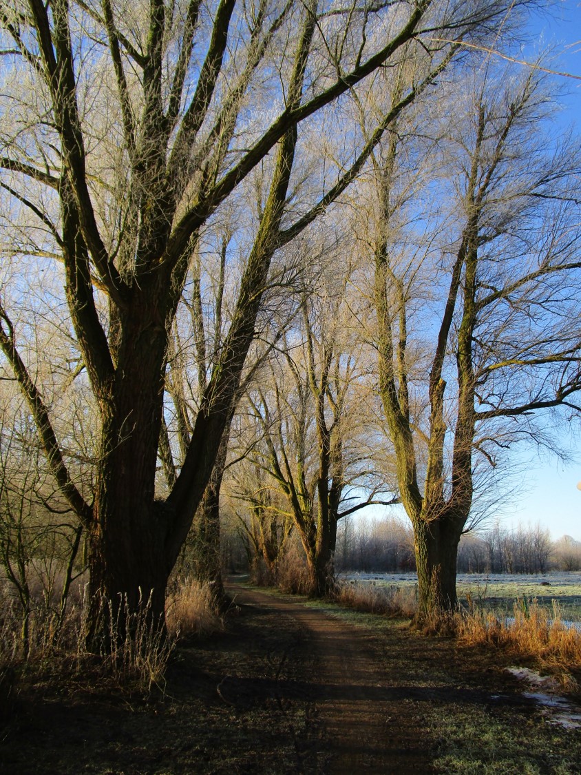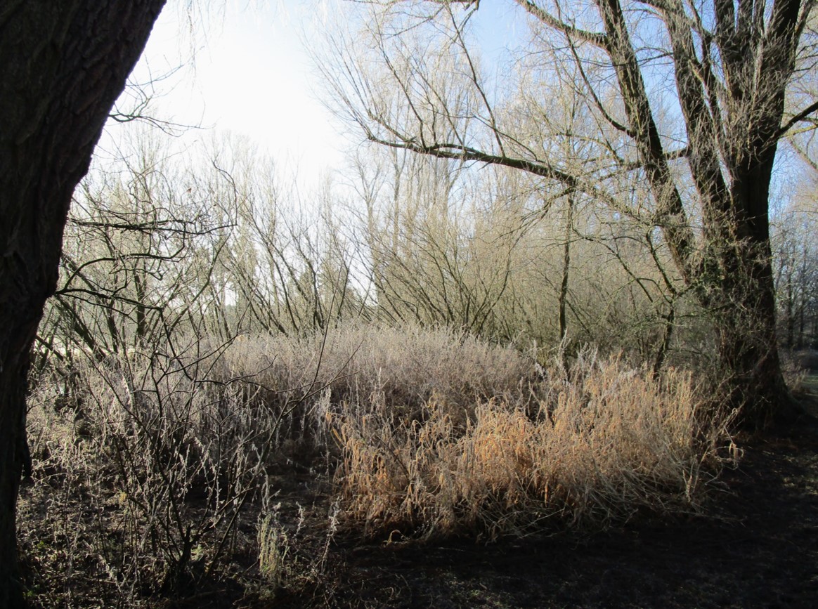 Gestern, Sonntag Morgen an der Krückau, Elmshorn – AltWeiden, Wintersonne taut Raureif, dreidimensional.