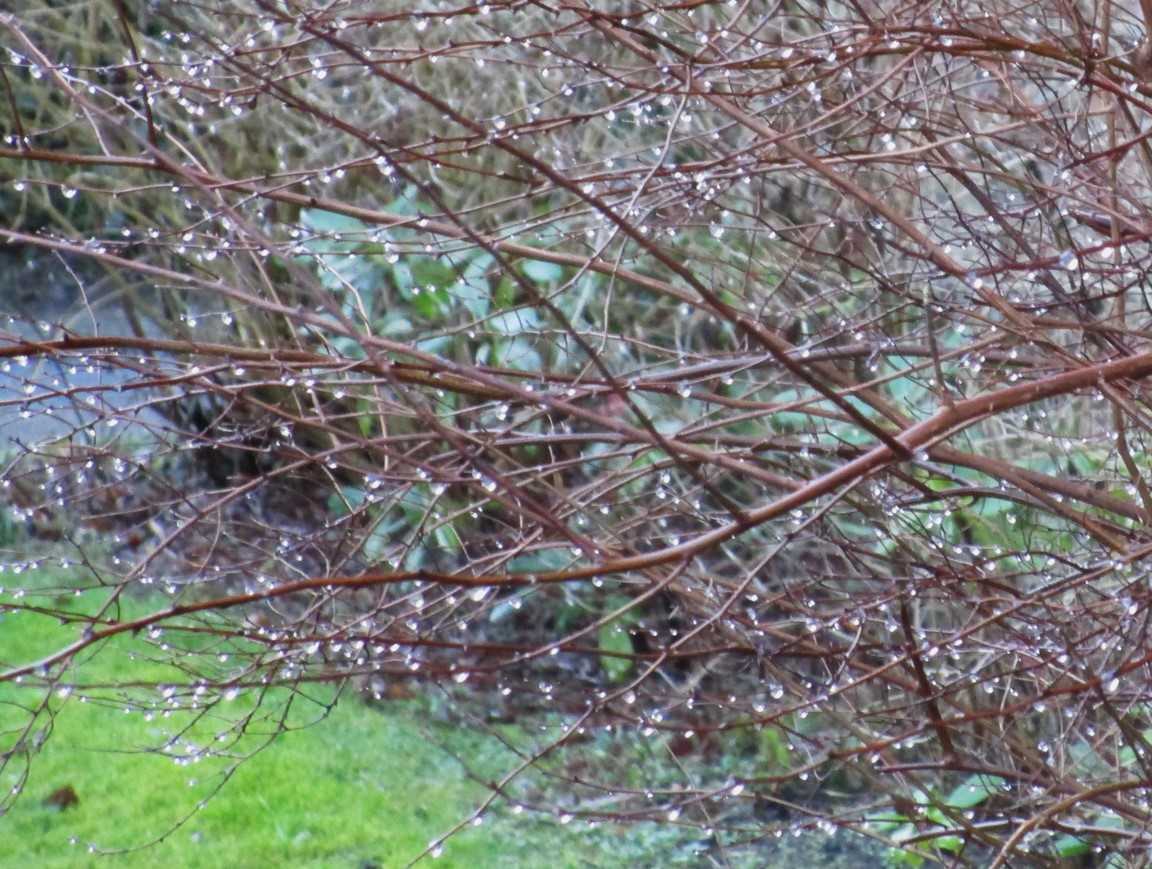 Zu Hause hole ich das unterlassene Startfoto nach. Wasserperlen in Spiräe – nicht mehr halb so beeindruckend wie beim Start, aber immerhin eine Ahnung, welch abweichenden Eindruck Kleinklima gegenüber all den anderen Fotos bewirkt.