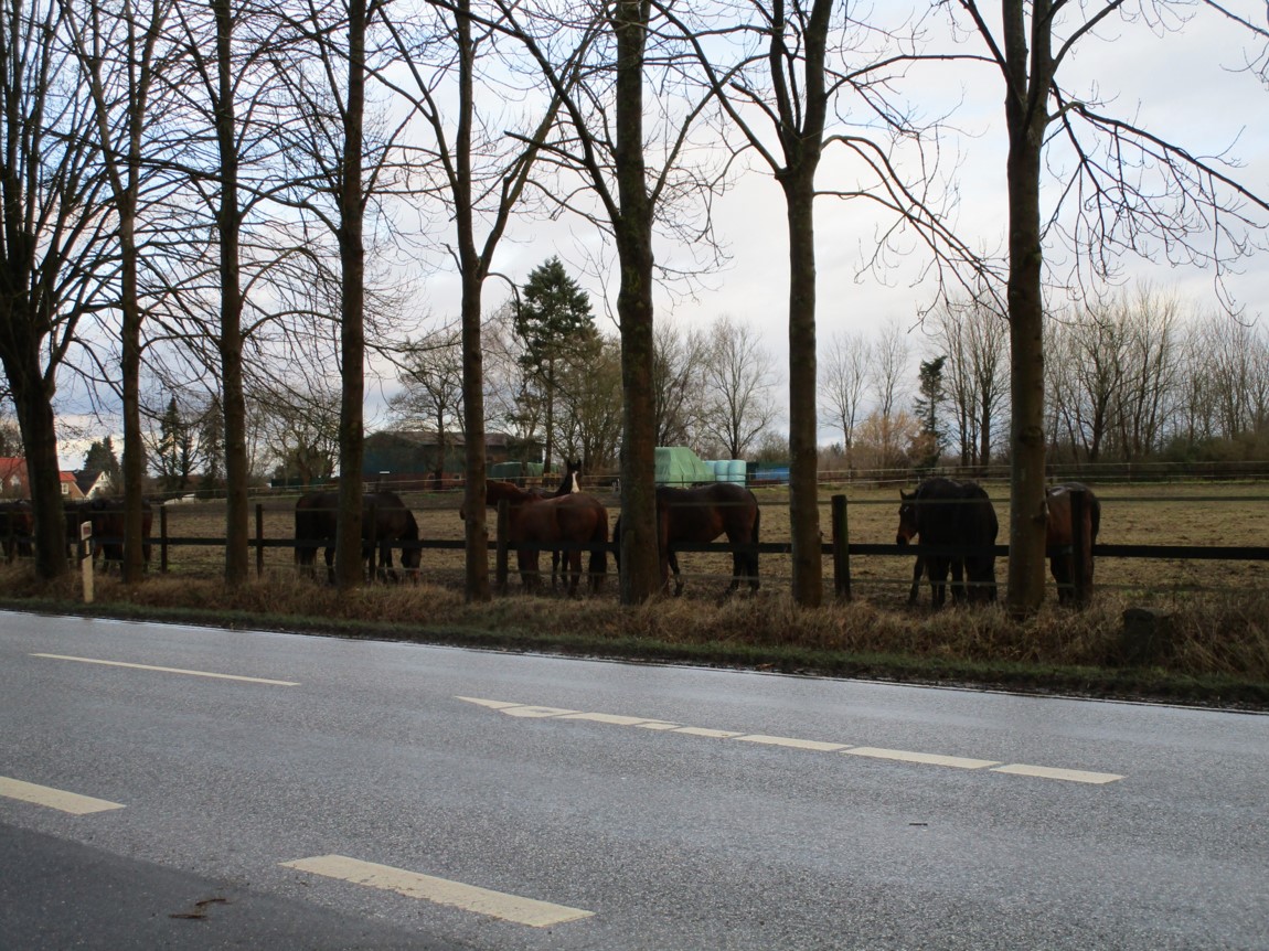 Die gestern in Abendsonne-Formation nicht mehr erhaschten Pferde stehen heute linienförmig.