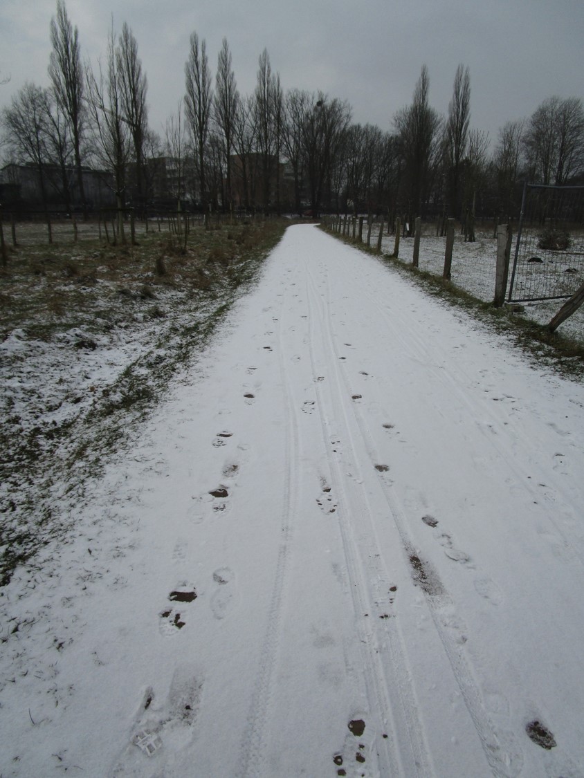 Kein Schwarz-Weiss-Foto, das rote Spielmobil parkt an der S-Bahntrasse. – Hin- und Rückweg – heute wieder ohne Weiss, in Farbe – stellen sich gestern kurzfristig winterlich dar.