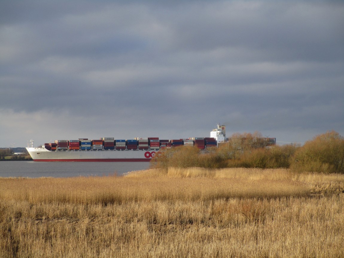 Wedel und Umrum – Containerfrachter querab Hetlingen.