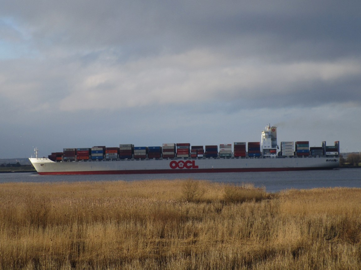 Es ist die OOCL Seoul, mit 323 x 43 m keins der großen Schiffe, mit ca. 12 m Tiefgang aktuell werden die möglichen 14,5 m nicht ausgenutzt. Das Schiff fährt – wie die meisten – nicht vollbeladen.