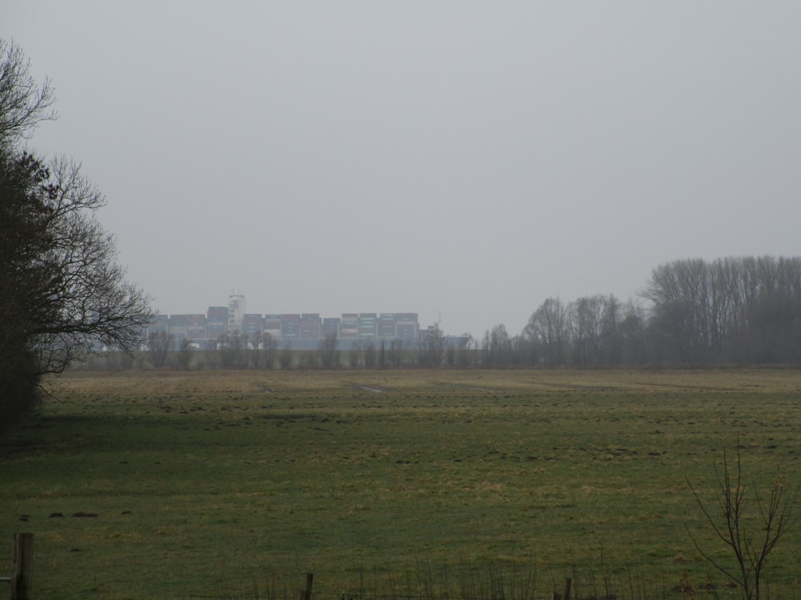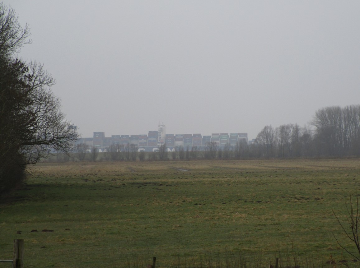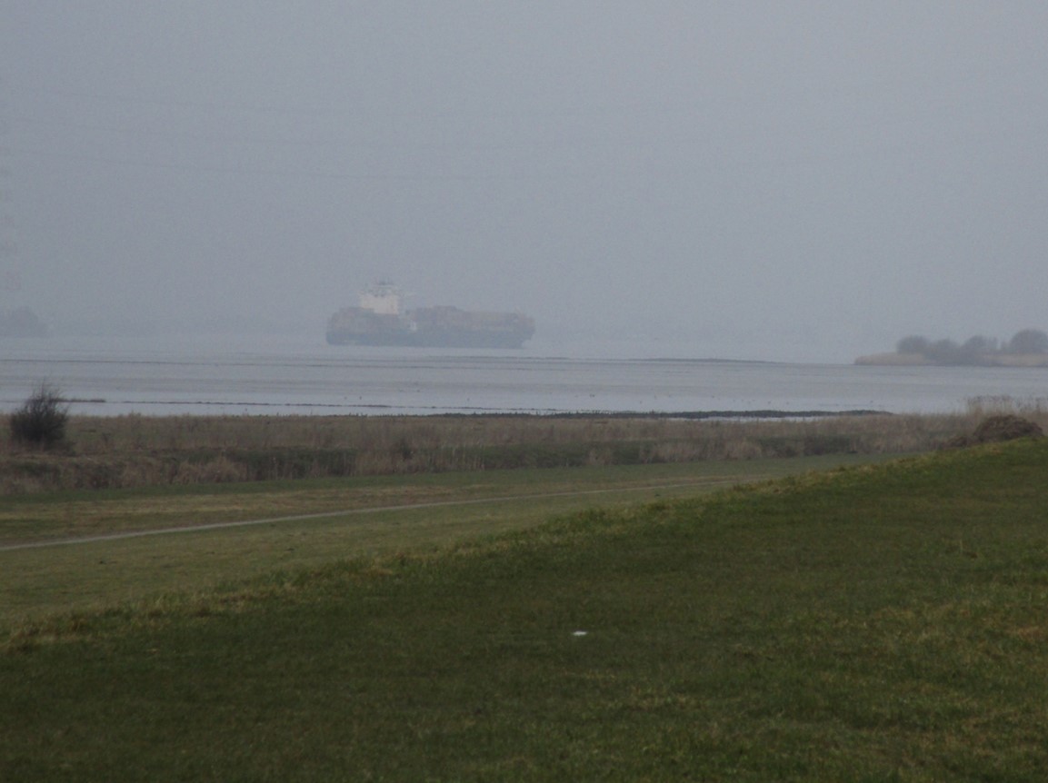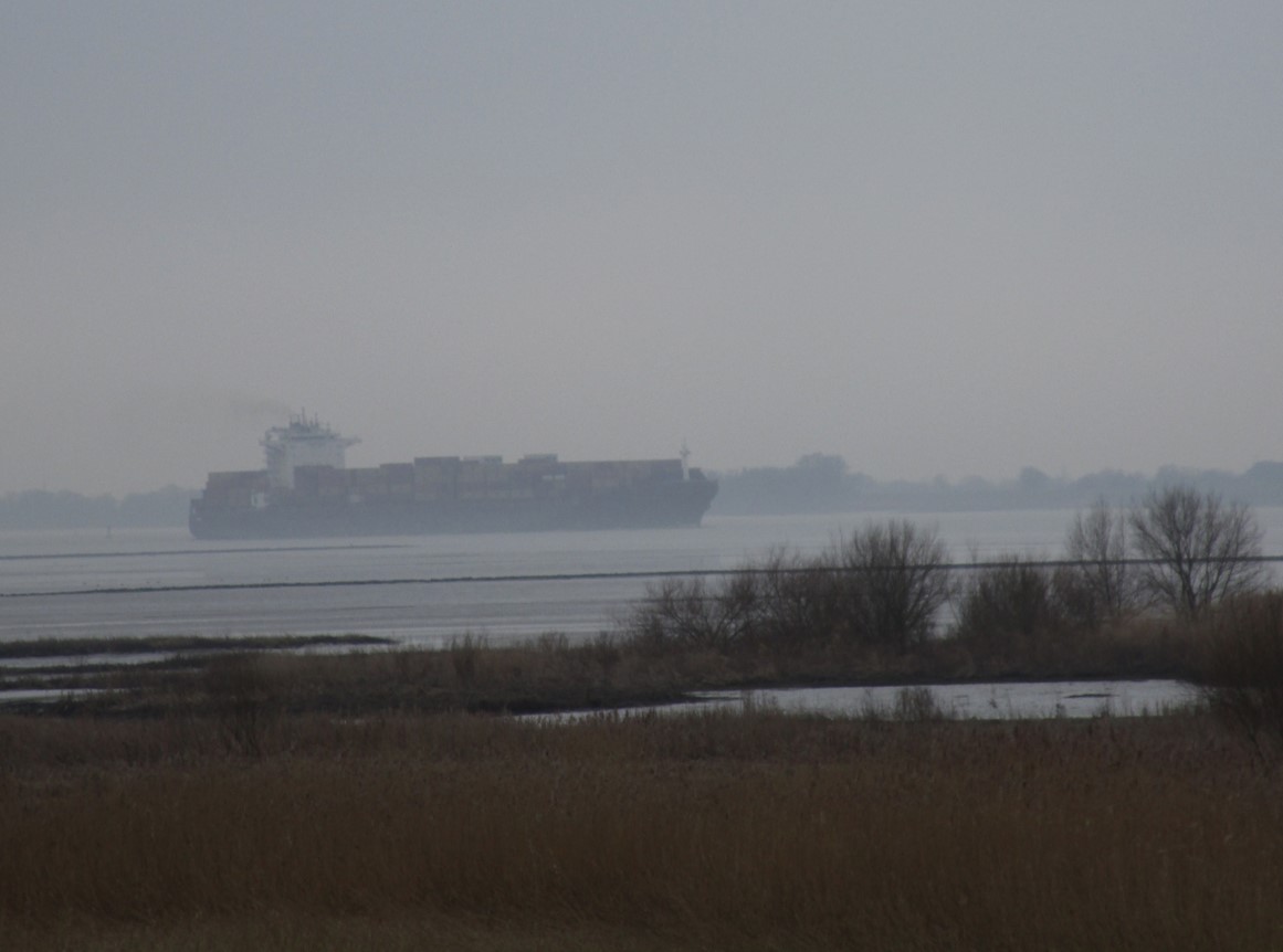 Auf dem Hetlinger Elbdeich – vom HHHafen zieht ein kleinerer Containerfrachter seewärts, die MSC Lausanne, 283 x 40 m, TG 13 m.