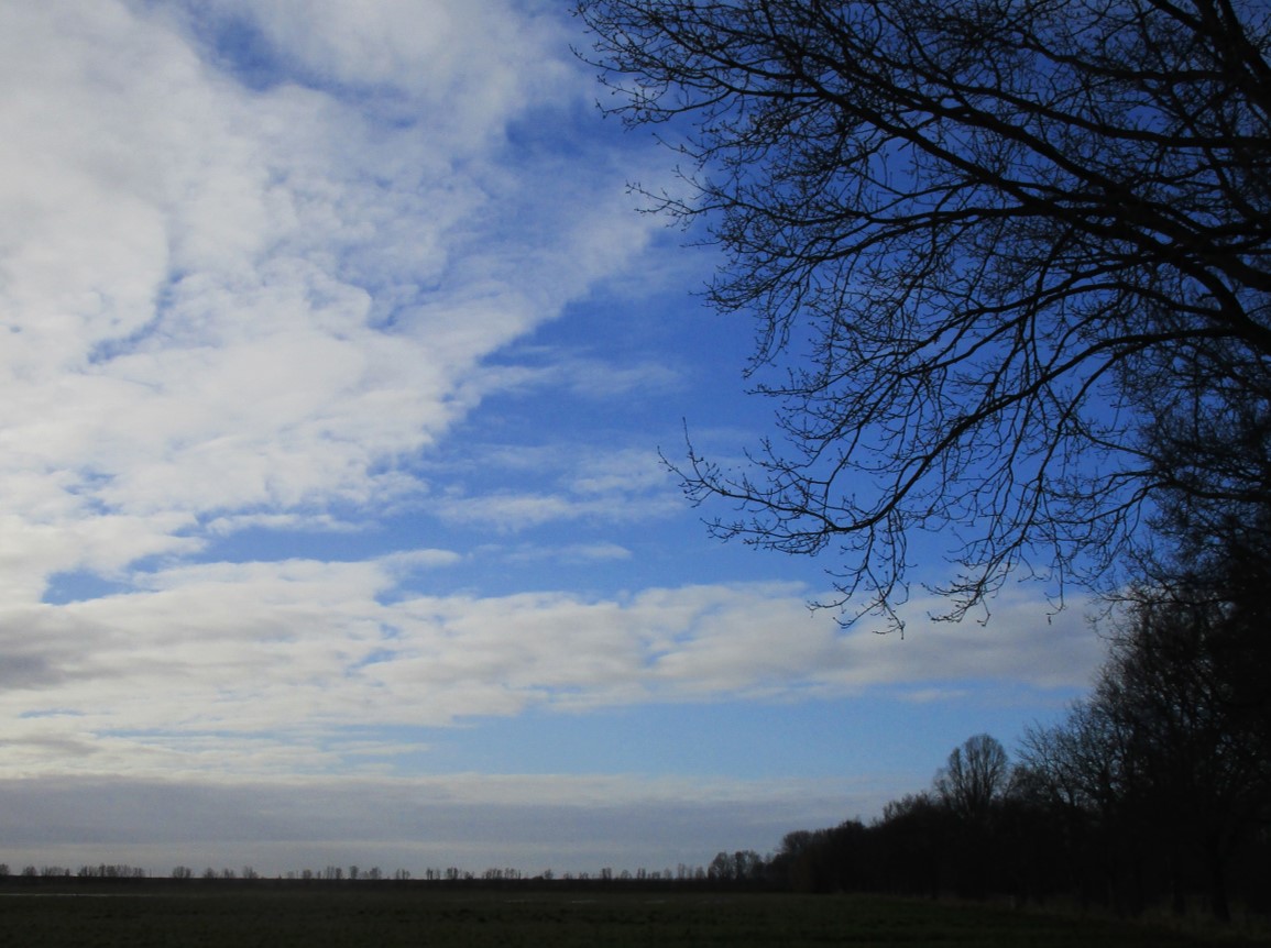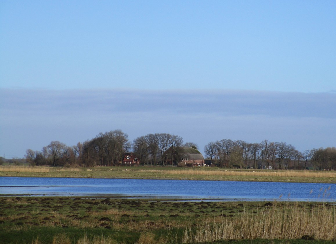 Blauer Himmel, blauer Marschenflachsee – im Hintergrund Idenburg, mit dem noch leeren Storchennest.