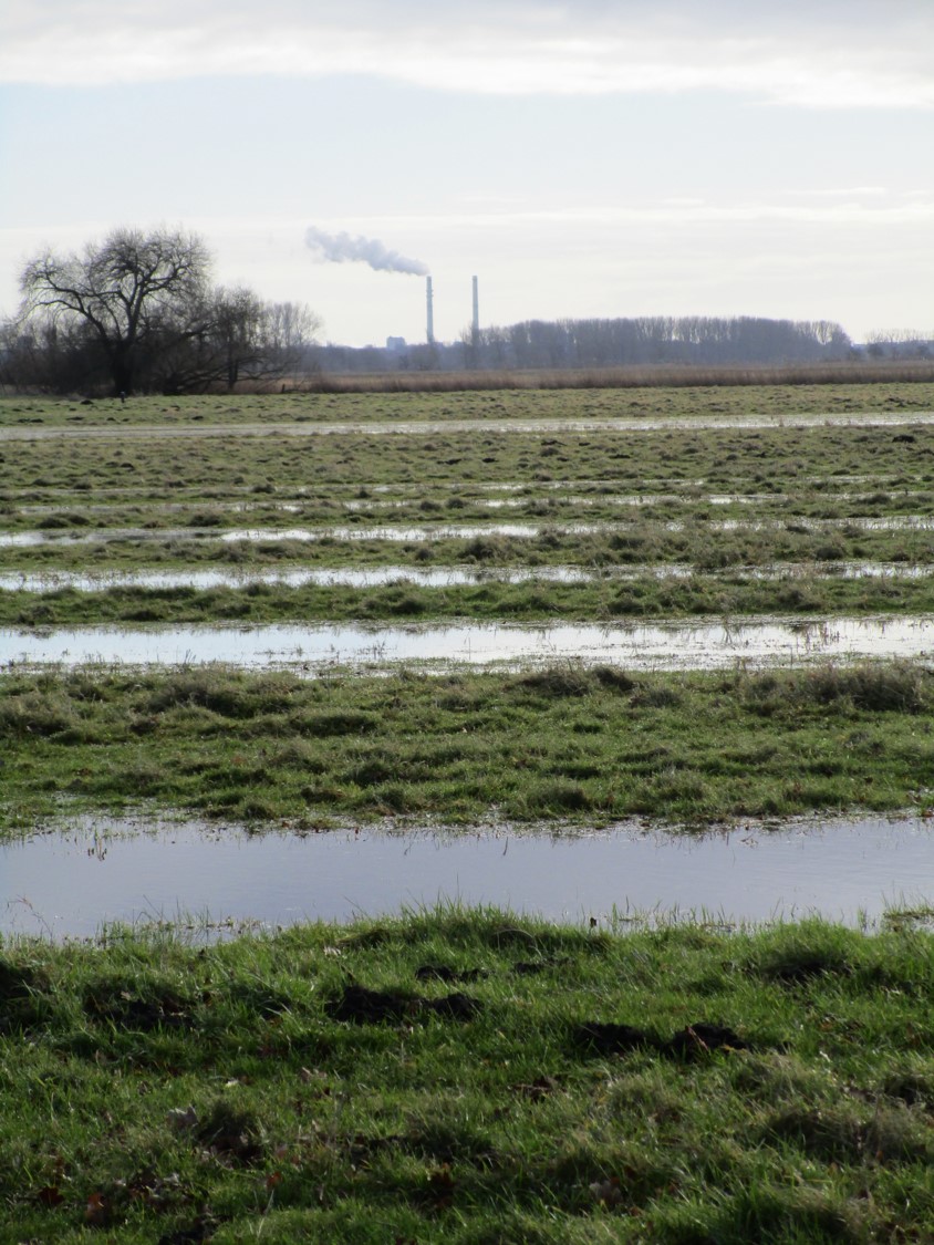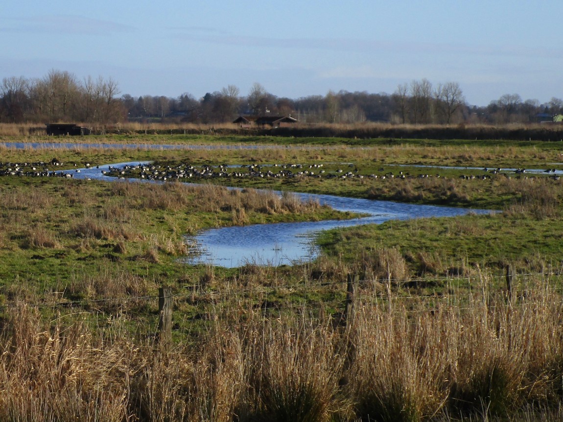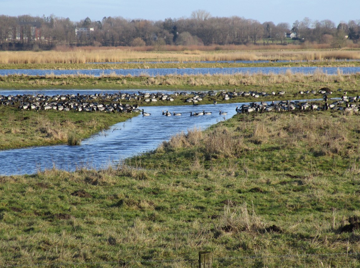 Nonnengänse westlich der Vogelstation – und ein Wasserhindernis, randvoll gefüllter Altmäander.