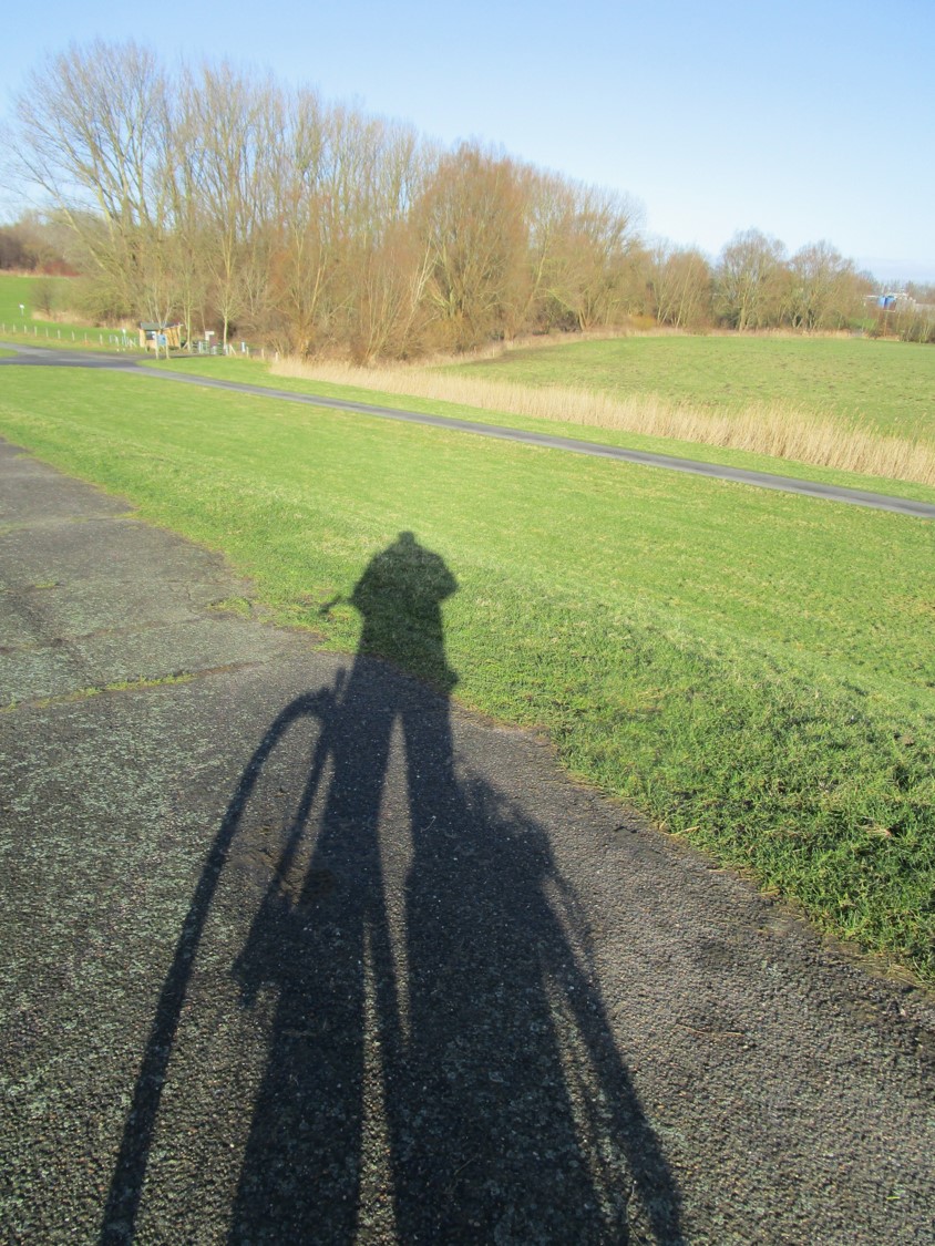 Der aus Sichtschutzgründen beidseitig mit Erdwall versehene Zugangsweg lässt die Nonnengansgruppe zum Klumpen werden. – Nicht im Foto zu sehen, aber regelhaft, flattern ein paar am Zaun Geknüllte auf, queren die Zuwegung. An ihrem Landeplatz erwartet sie … s. Fotos hiervor.