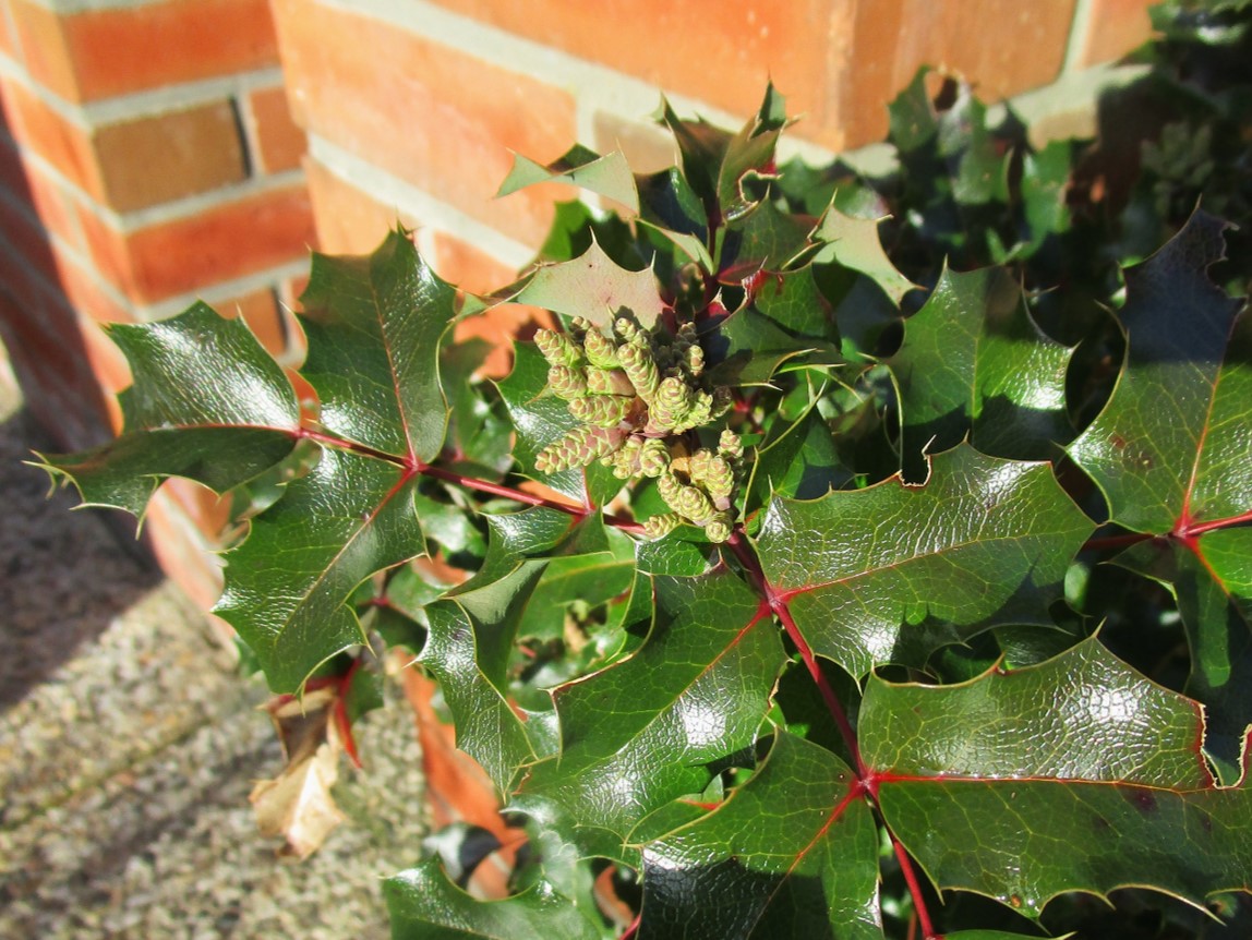 Auch auf der Geest pfeift der Wind, kühl. Die Mahonie an unserem Eingang hält die Blütenstände noch winterlich klein.