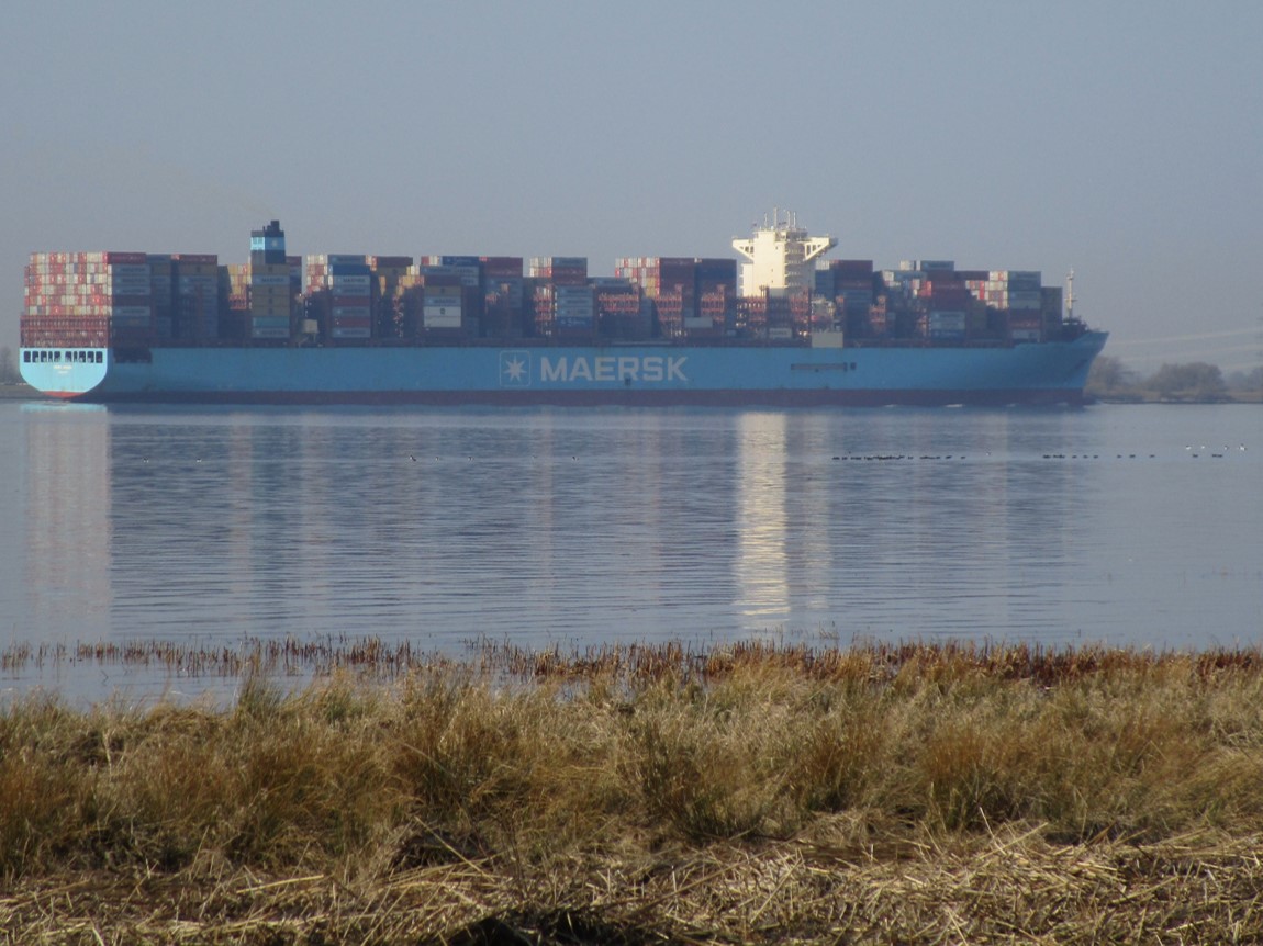 Es ist die MAERSK Herrera, 353 x 54 m, vom möglichen Tiefgang von 16,4 m lediglich 12,9 aktuell nutzend.