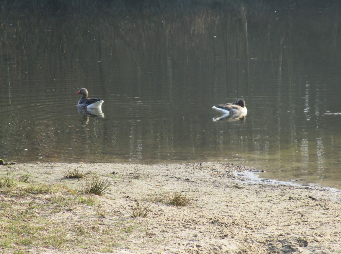 Ein Grauganspaar – so lange der Wasserstand hoch bleibt, brüten verschiedene Vogelarten auf 2 kleinen Inseln. Die verbinden sich in Trockenjahren allerdings fast vollständig mit dem Ufer, Rummel vertreibt die Vögel (mit Glück erst nach erfolgter Brut).