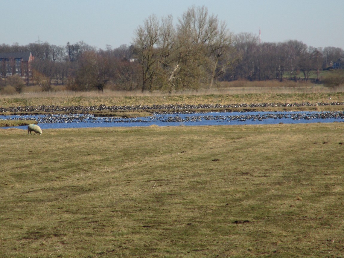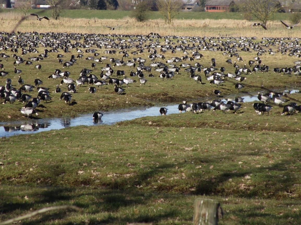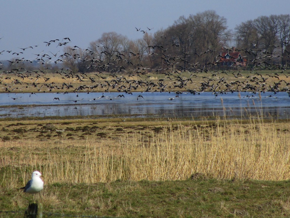 Nördlich Idenburg, Blick Elbdeich – da wurden tausende Nonnengänse wieder einmal hochgebracht, ihr Lärm schallt über die Marsch.
