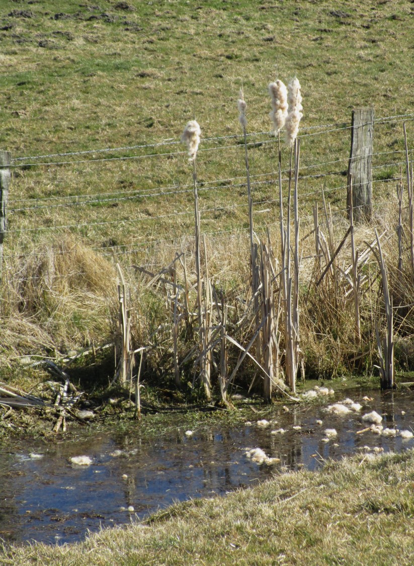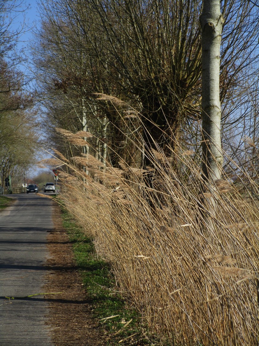Querab Klärwerk Hetlingen, der Sturm jagte mich auf dem Rad hinterm Deich entlang. Vorjahrs-Reet neigt sich heftig im Sturm – ich radele quer, später frontal zum Sturmwind (brauche zwar nicht zu schieben, 1. Gang ist aber zeitweise nützlich bis unverzichtbar).