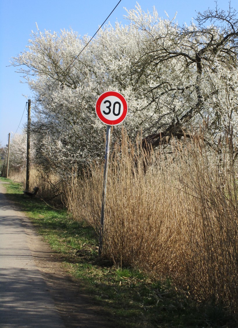 Von Westen anradelnd blicke ich auf Schlehen- und Mirabellenblüte …