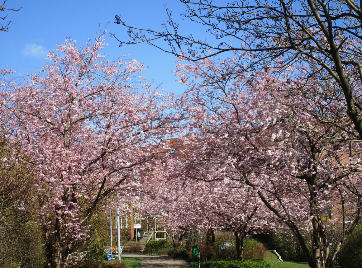 Auf der Geest blühen frühe Japanische Kirschen als Großbäume, …