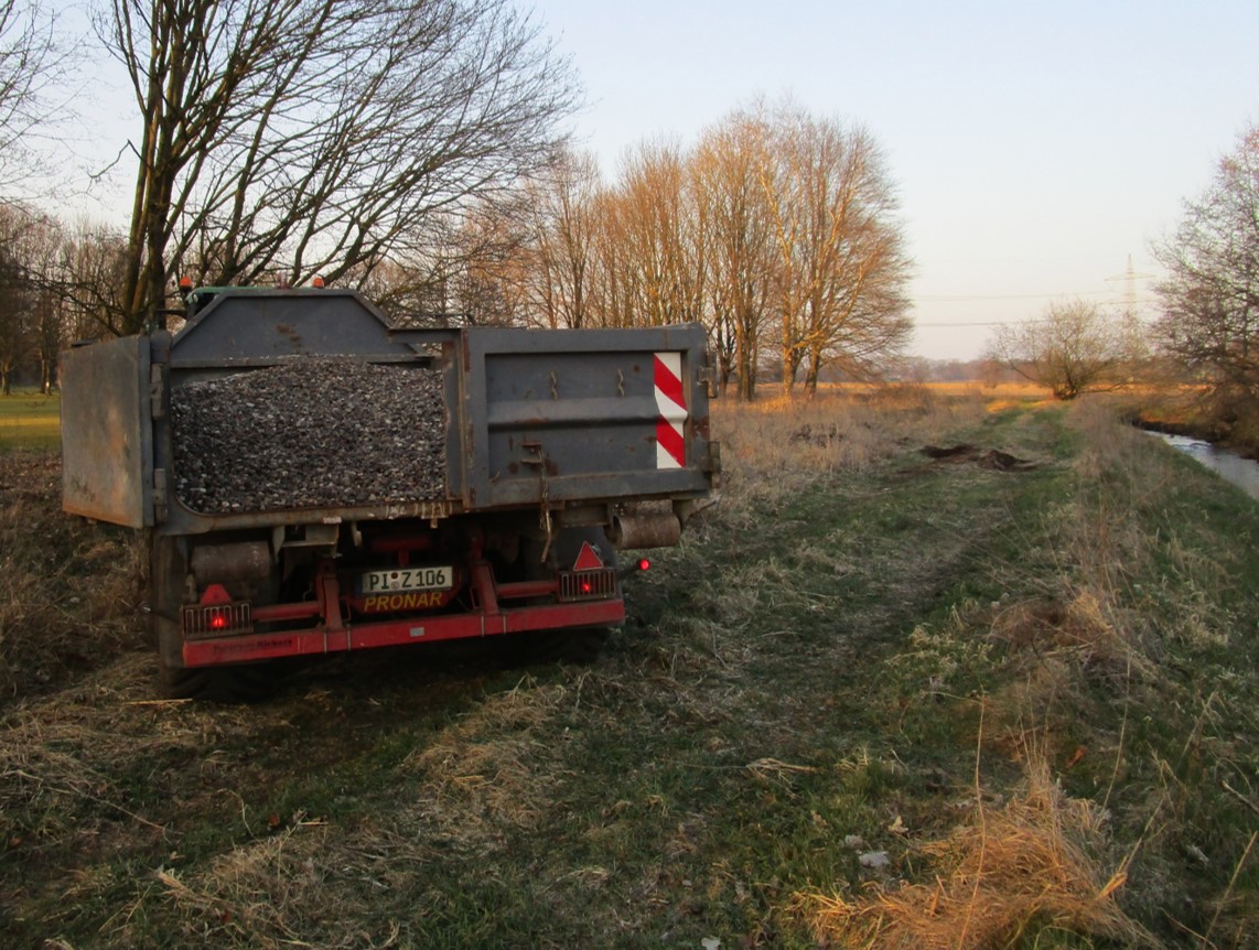 Für den Nachmittag ist Anlieferung eines zwischengelagerten Sattels Kies (25 t) in 3 Fuhren per Trecker mit Mulde verabredet.