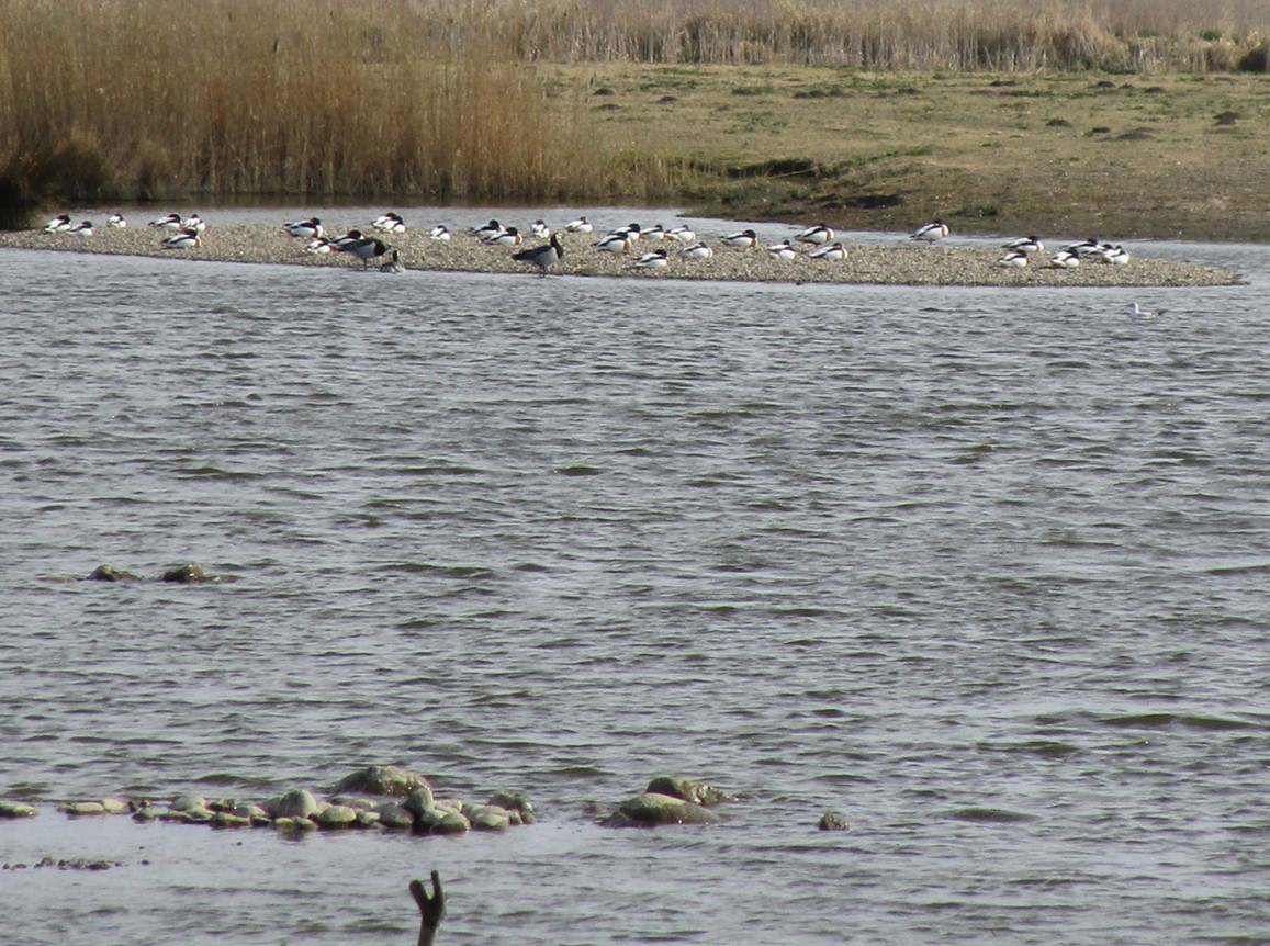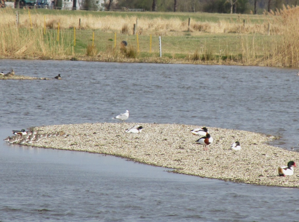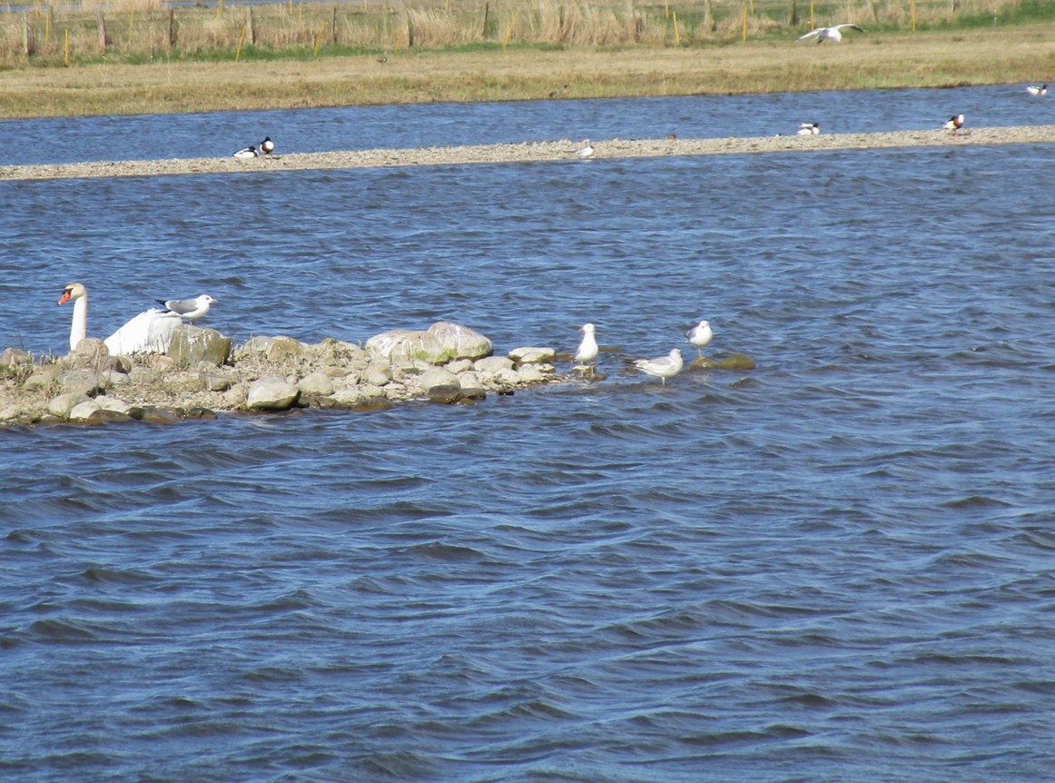 Letzter Inselblick – eine Brandgansinsel. – – – Links, dicht an dicht, liegen keine Steine! Nachfrage ergibt, dass dies Alpenstrandläufer im Schlichtkleid sind.
