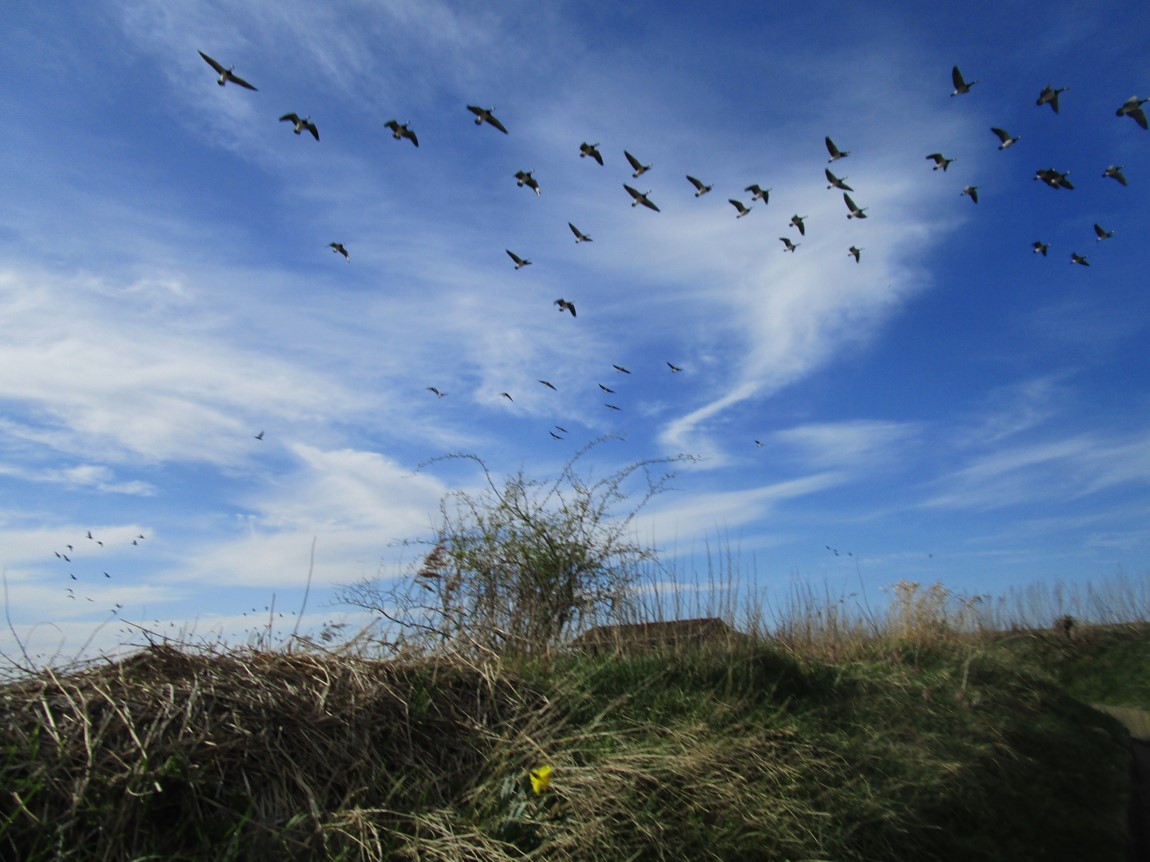 Blick vom Elbdeich Fährmannssand über die Marsch Richtung Geest. Zwischendrin schwarzweisses Gewimmel – ein großer Nonnengansschwarm, sitzend, zufliegend.