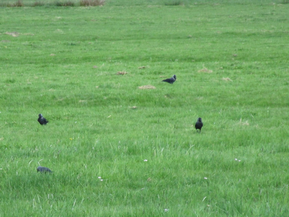 Die Jahreszeit, gefördert von Nebelfeuchte, lässt Insekten- und Wurminteressenten wie hier Dohlen intensiv Flächen abpatrouillieren. Futter winkt.