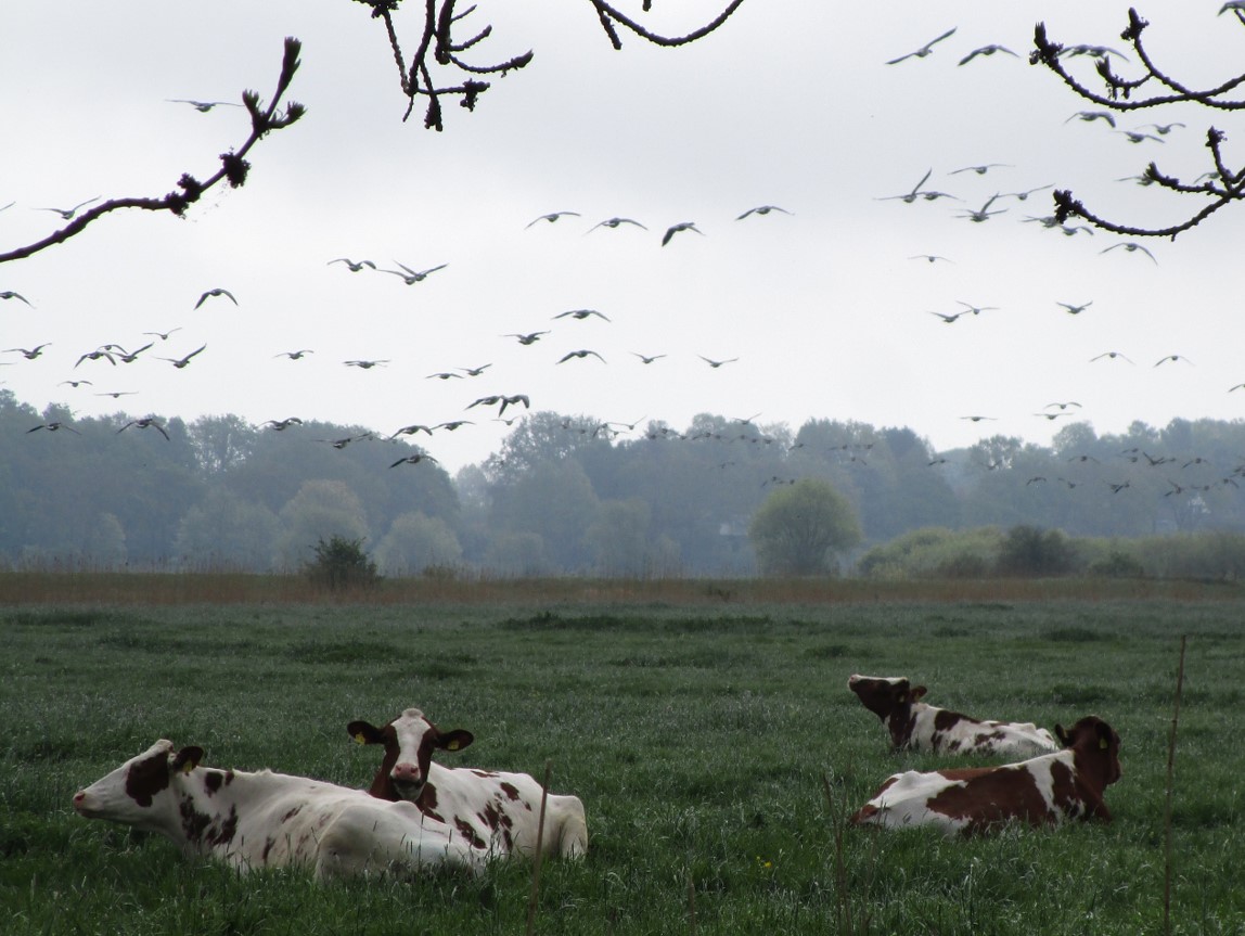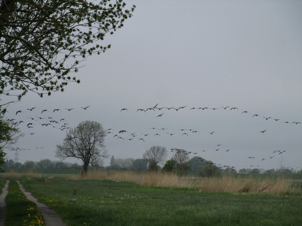 Ist dies die Hälfte der Gösseln, die Pferden und Reitern zwischen den Beinen rumwuselten, nachdem sie den Dachrutsch und den Bodenaufprall erfolgreich gemeistert hatten? – Jedenfalls lassen die mich sehr dicht ranradeln, bevor sie kurz auffliegen.