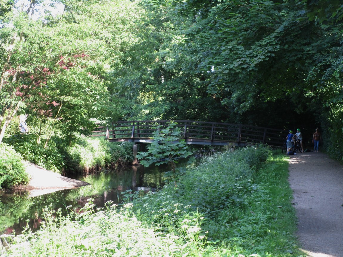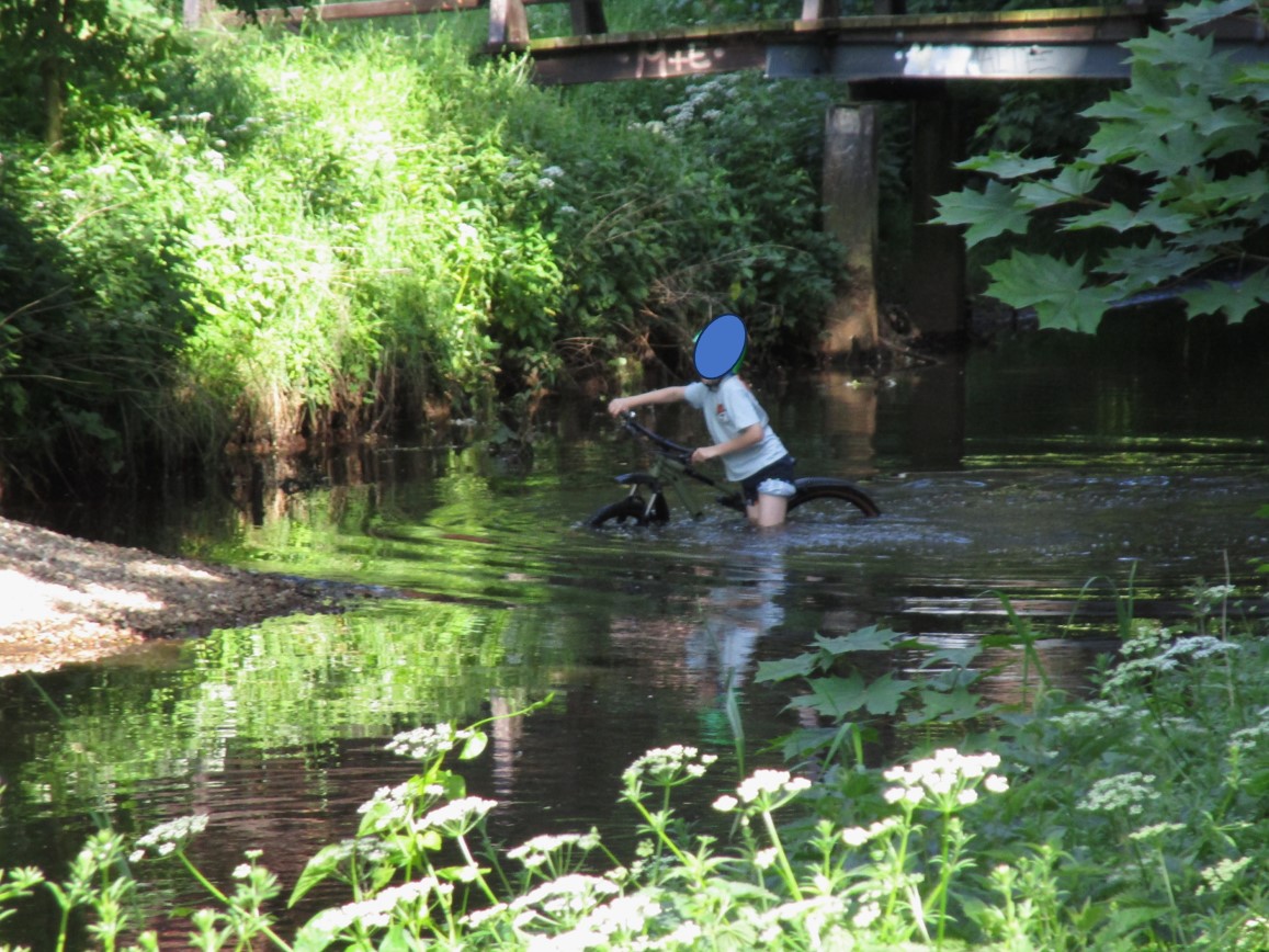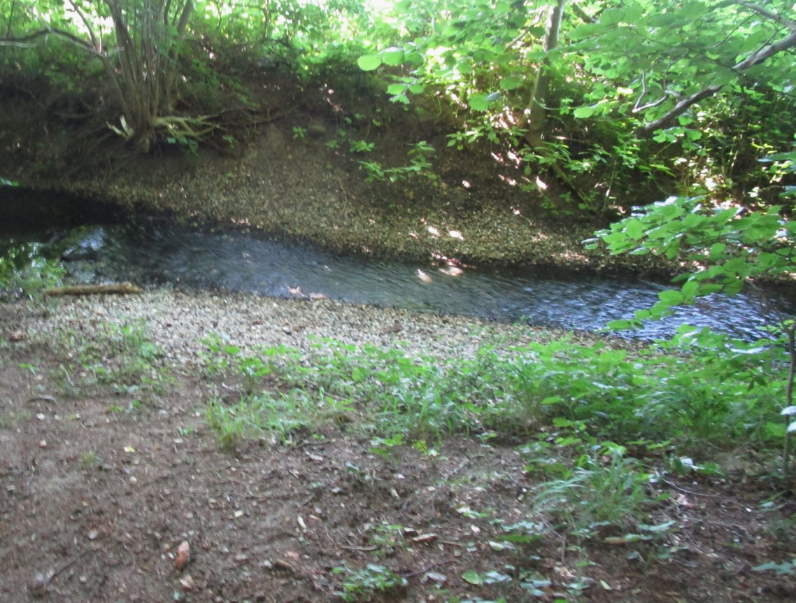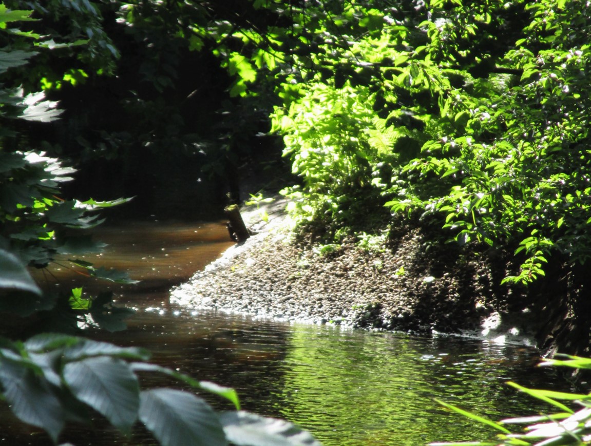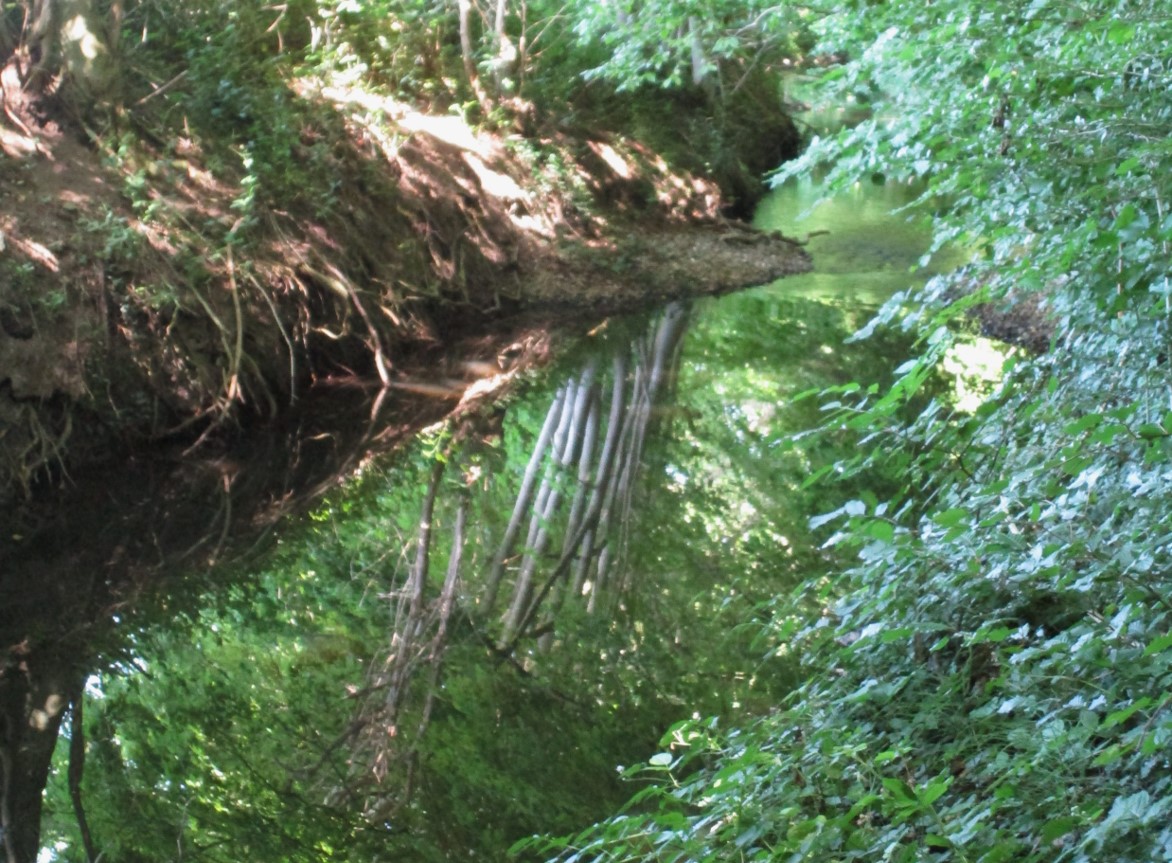 Mühlenau bachauf Bahnquerung – Beispiel schier unvorstellbarer Überbreiten unserer Fliessgewässer. Spiegel ersetzt Bewegung.